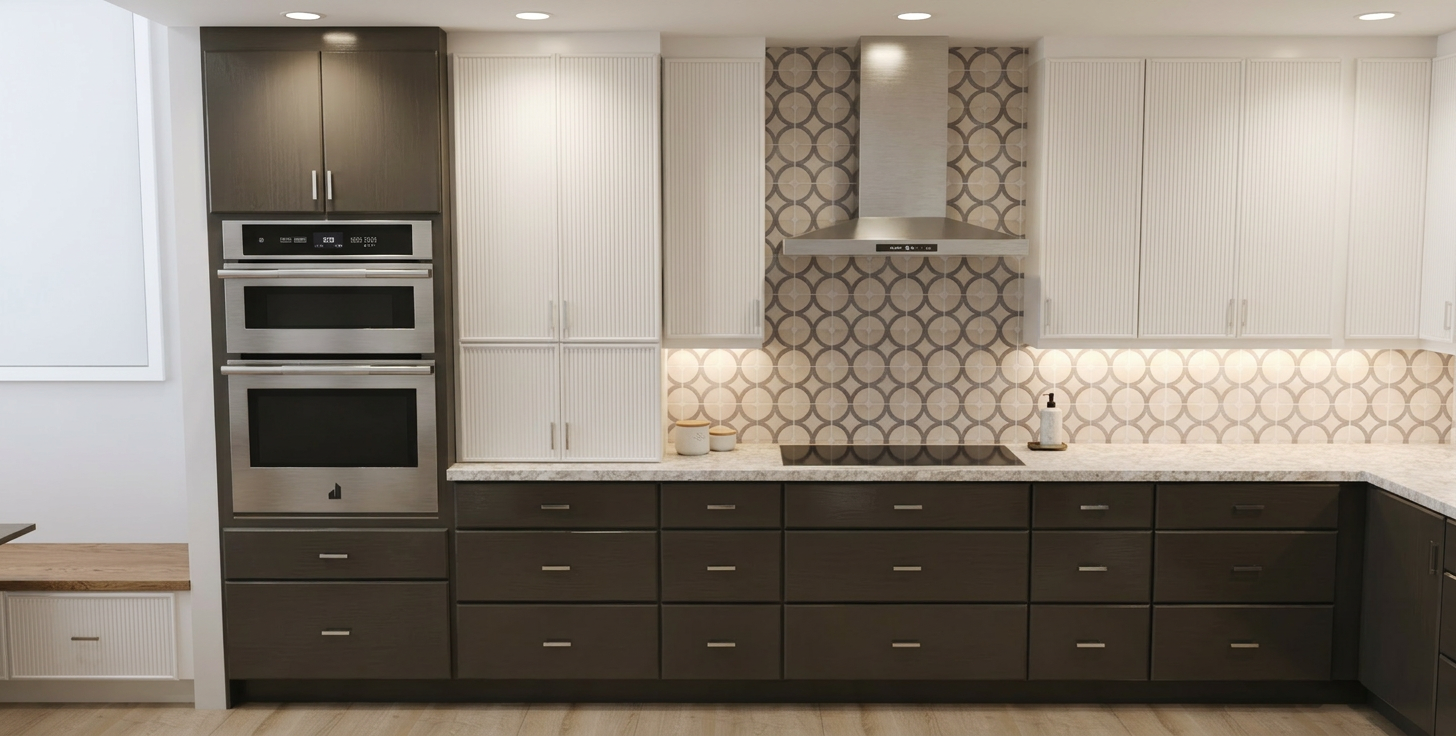 the cabinetry should be shown in a rift cut white oak wood with a light stain color all marble shown should be in a honed finish please do not change any materials or any architecture shown in the image please add some bathroom style decor i e rolled towels nice looking bottles lush plant or florals etc to the floating shelves
