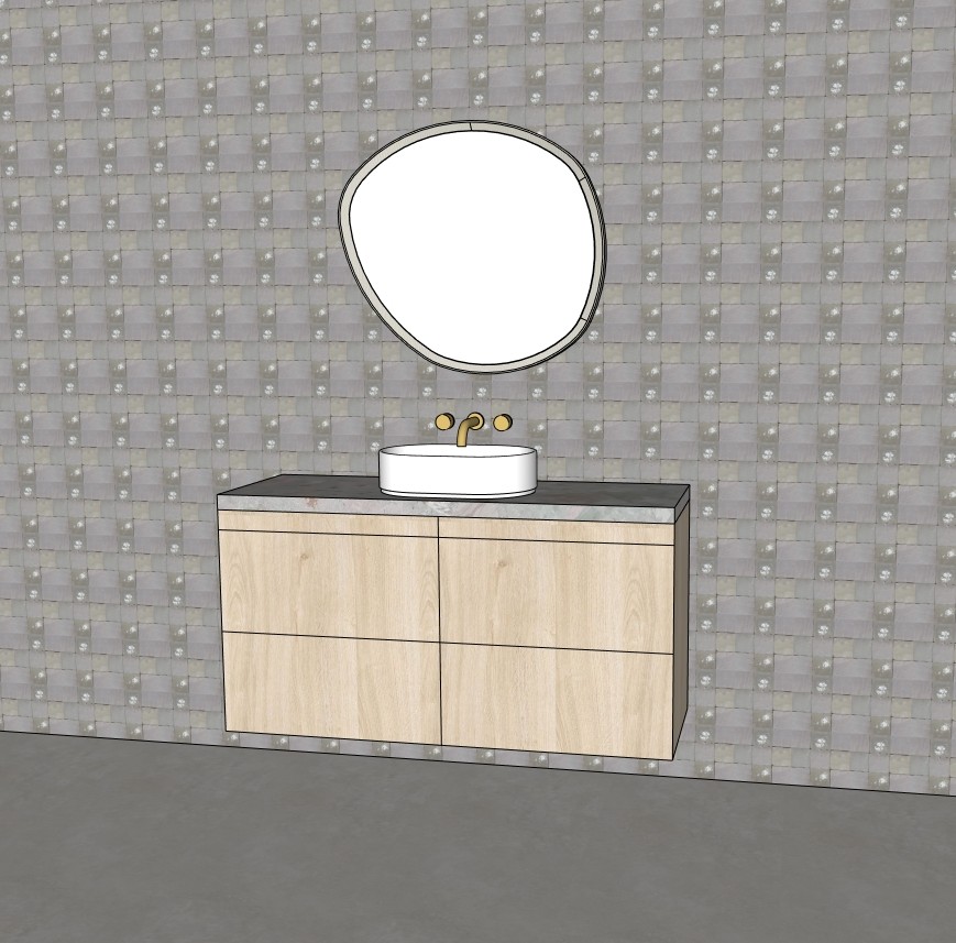 retain all existing materials finishes layout and perspective from the original bathroom image do not modify the tiles fixtures cabinetry or overall design enhance the mirror by adding a concealed led backlight behind it creating a soft halo glow around the mirror edges introduce warm elegant ambient lighting throughout the bathroom to create a calm and sophisticated atmosphere the lighting should be soft and warm around 3000k highlighting the materials while keeping the space relaxing and refined maintain all textures exactly as they are in the original image while improving realism with natural reflections soft shadows and balanced illumination keep the same camera angle and composition while producing a highly realistic architectural render