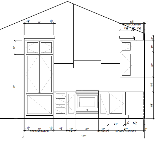 show me this kitchen elevation in a darker red oak cabinetry with heavy graining inlcuding panel ready fridge with brass hardware shelves out of wood too range hood white plaster black countertops a white handmade backsplash look