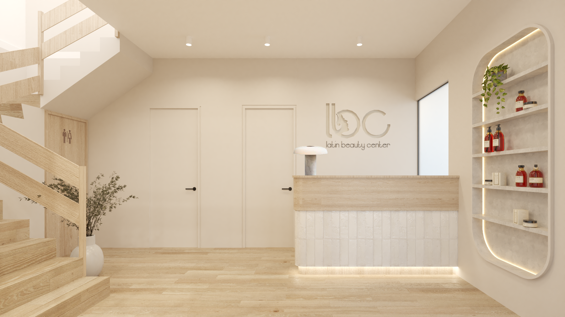 interior design of a modern minimalistic conference room with a calming and welcoming atmosphere the walls are painted in soft cream complemented by warm wooden flooring the ceiling features recessed lighting with soft ambient tones the room has pale mint green chairs arranged in rows facing a large blank projection screen on the right natural wood cabinets with a white countertop small sink and stylish green potted plant add a touch of nature sheer white curtains allow diffused light in casting soft shadows on the wall a tall mirror stands at the left reflecting the serene space large leafy green plants on the right provide freshness the atmosphere is peaceful and conducive to learning