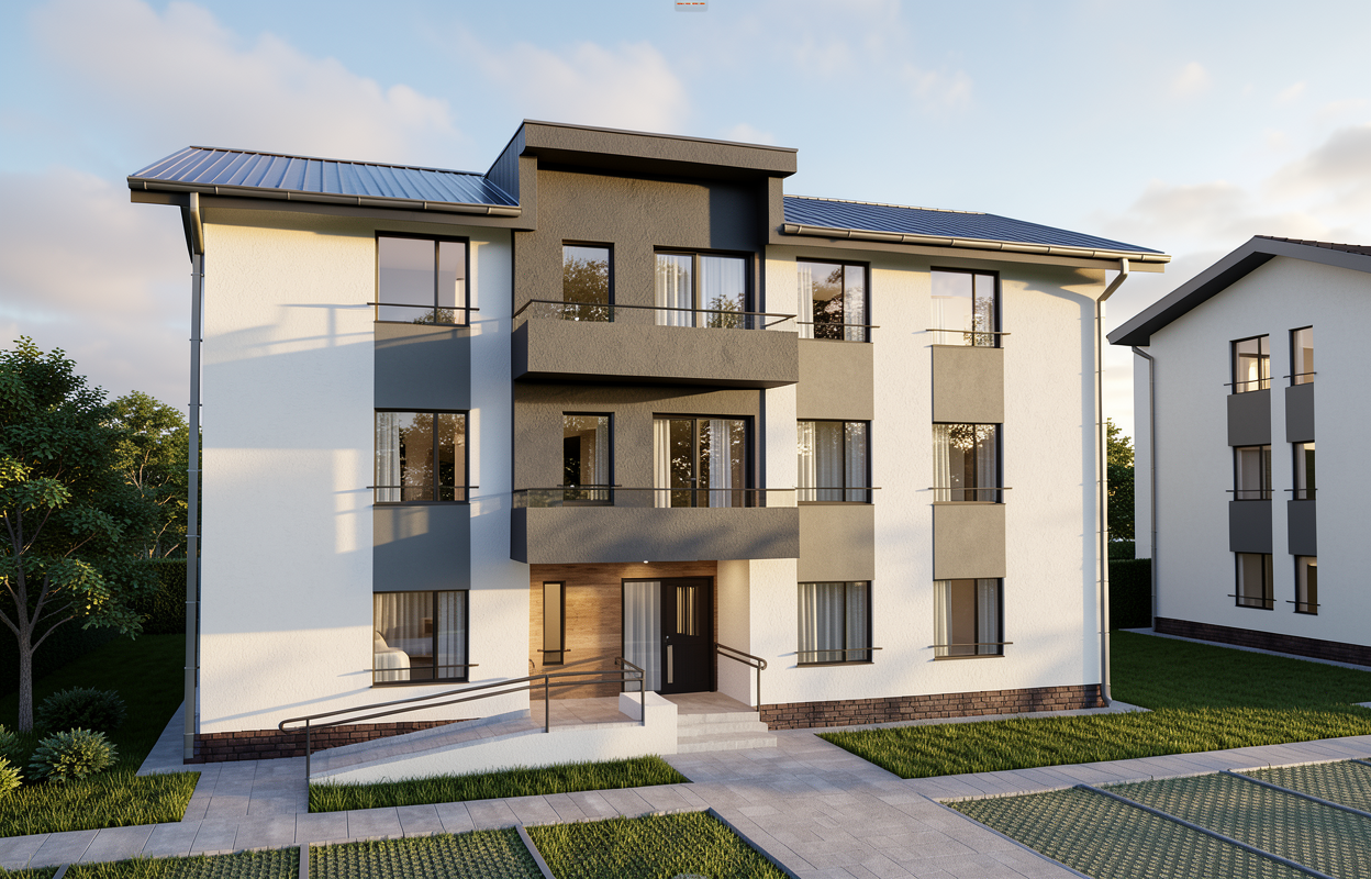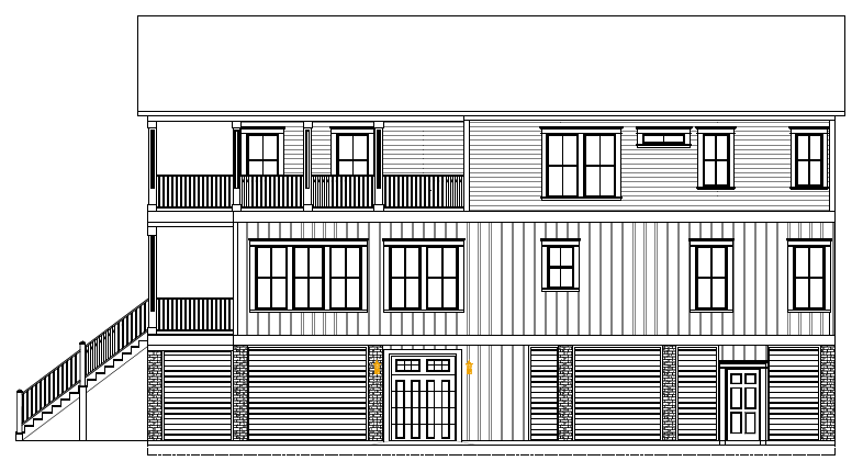 render a beautiful architectural scene of a three story house with a rustic and cozy atmosphere the top and middle levels are adorned with horizontal wooden planks painted in a soft off white lending an airy and clean appearance the bottom level features vertical wooden panels with a natural warm oak finish the windows are large and framed in dark charcoal gray providing a striking contrast the railings of the balconies and the staircase are crafted from iron with an elegant matte black finish add soft golden ambient lighting to create a welcoming glow around the entrance and balconies the roof is a light weathered gray shingle blending harmoniously with the rest of the structure include a lush backdrop of greenery with subtle hints of autumn hues casting a serene and inviting ambiance