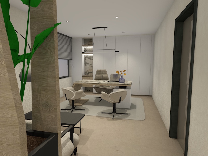 use beige mat big tiles for the floor glossy marble top for the marble on the conference table and more realistic plants add more general light keep the small tables with black top