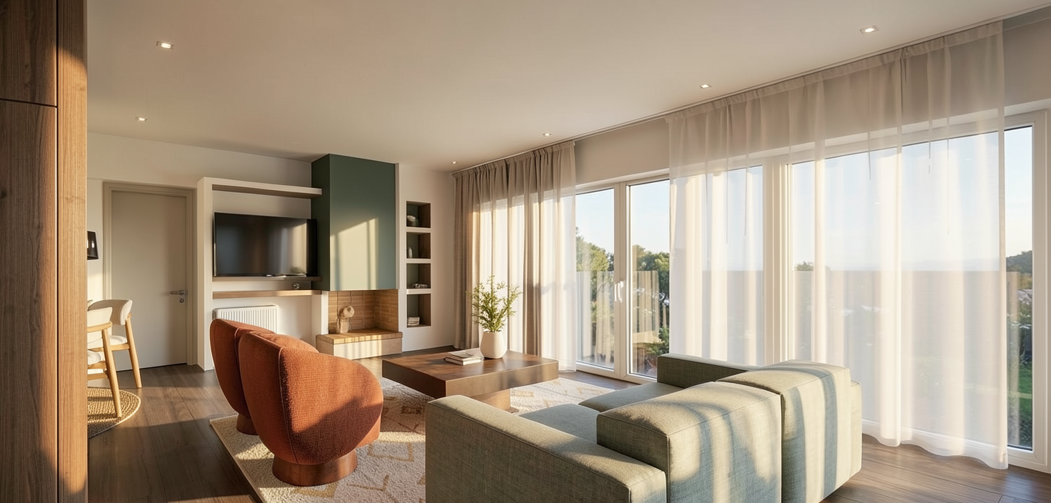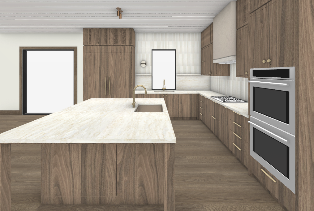render a photorealistic 3d perspective of this kitchen in a muskoka ontario reference the current material style just enhance them medium oak floors and trims medium oak reveal baseboards light beige matte quartz countertop with light golden veining vertical backsplash tiles light cream color satin brass faucet and cabinet handles very small oval sconce on left of the sink in cream stone and bronze frame keep geometry and materials light beige plaster hood fan with a reveal and stone trim below it white wood ceiling finish keep model geometry the same windows doors cabinets walls wall tiles kitchen island wall sconce ceiling light stone backsplash stone shelf hoodfan add a lake view to kitchen windows native to muksoka ontario add a few neutral accessories yo kitchen island and kitchen counter do not change the view only enhance the current materials and make the lighting more natural detailed textures atmospheric depth render in hyper realistic architectural visualization quality 8k resolution