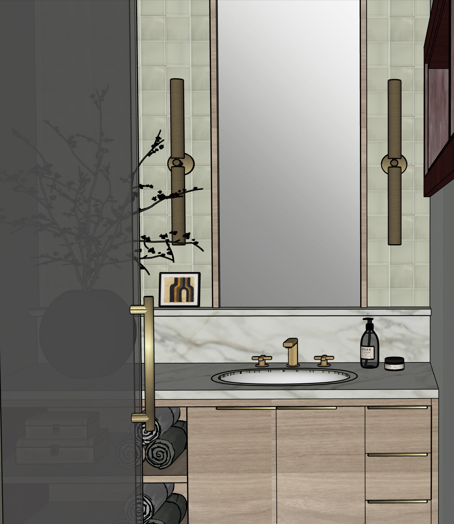 render an elegant bathroom scene focusing on a minimalist vanity use muted sage green tiles as the backdrop to create a calm and soothing atmosphere incorporate a large frameless mirror trimed on either side with wood with subtle reflections the vanity features light wood cabinetry with sleek brass handles and a white marble countertop with soft gray veining ensure the faucet and fixtures are in a luxurious brushed gold place a vase with delicate minimalist branches in silhouette form on the left include folded dark gray towels on open shelves for a touch of texture the scene should have a soft ambient light creating a tranquil and sophisticated environment