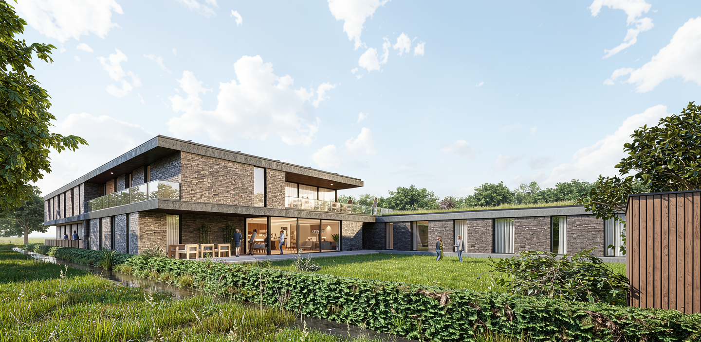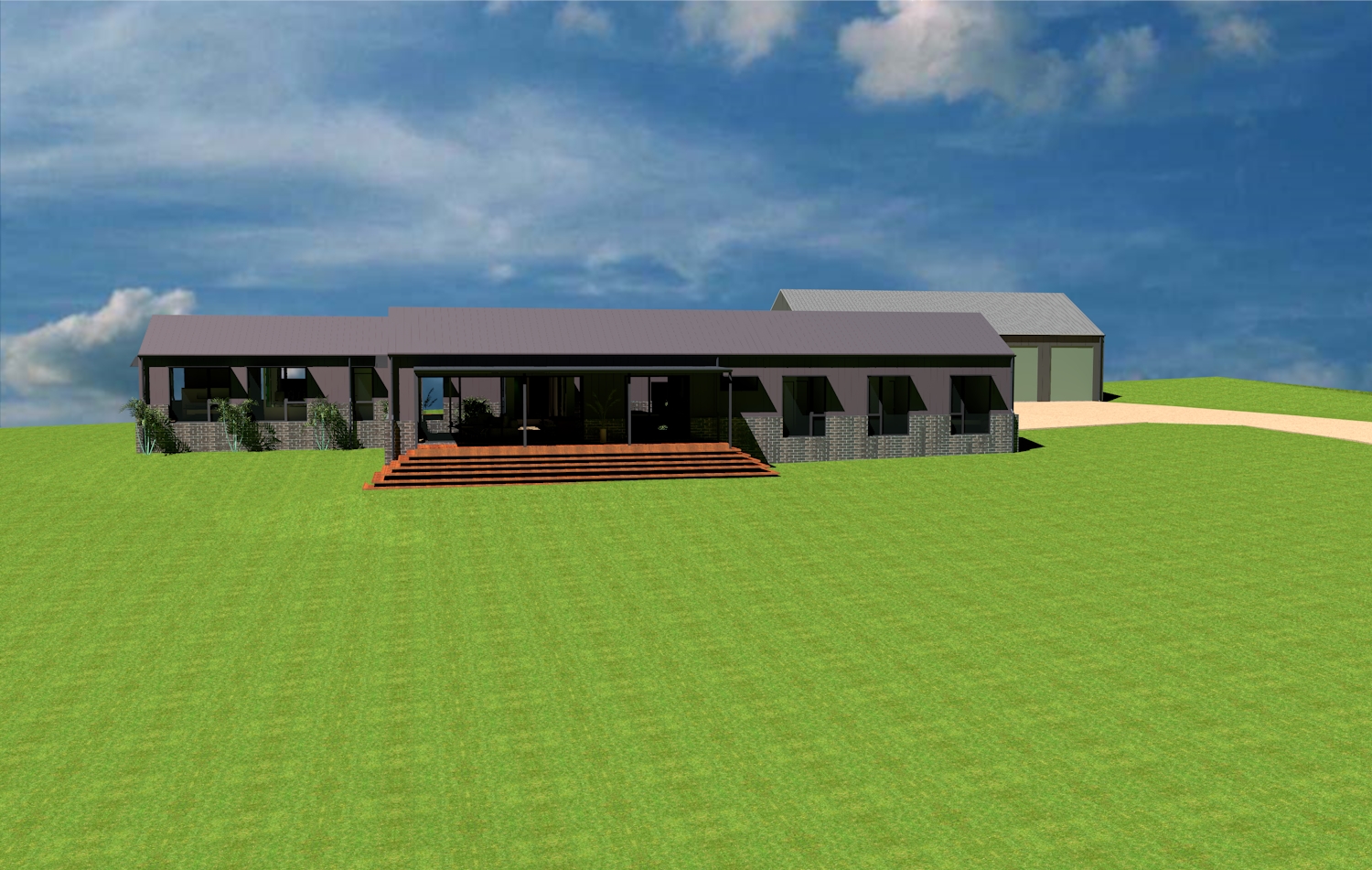a manicured lawn australian eucalyptus trees in background and foreground australian native ferns and plants garden beds low maintenance native shrubs native plants stone pathway leading to the entrance an outdoor kitchen entertaining area to the left with a skillion roof and a pathway to a firepit