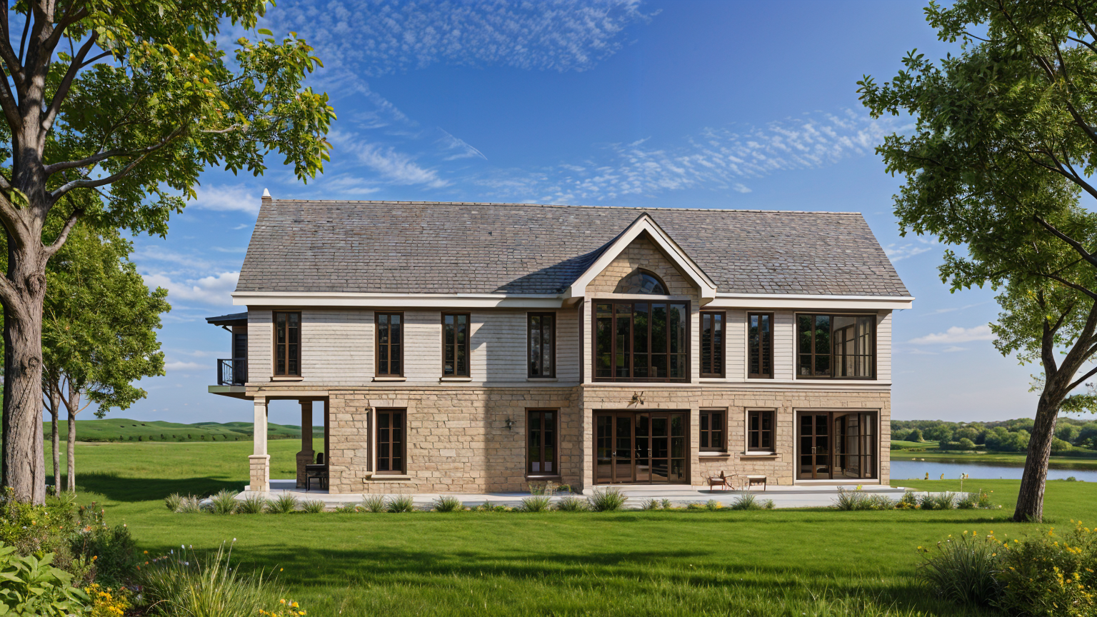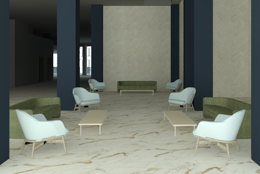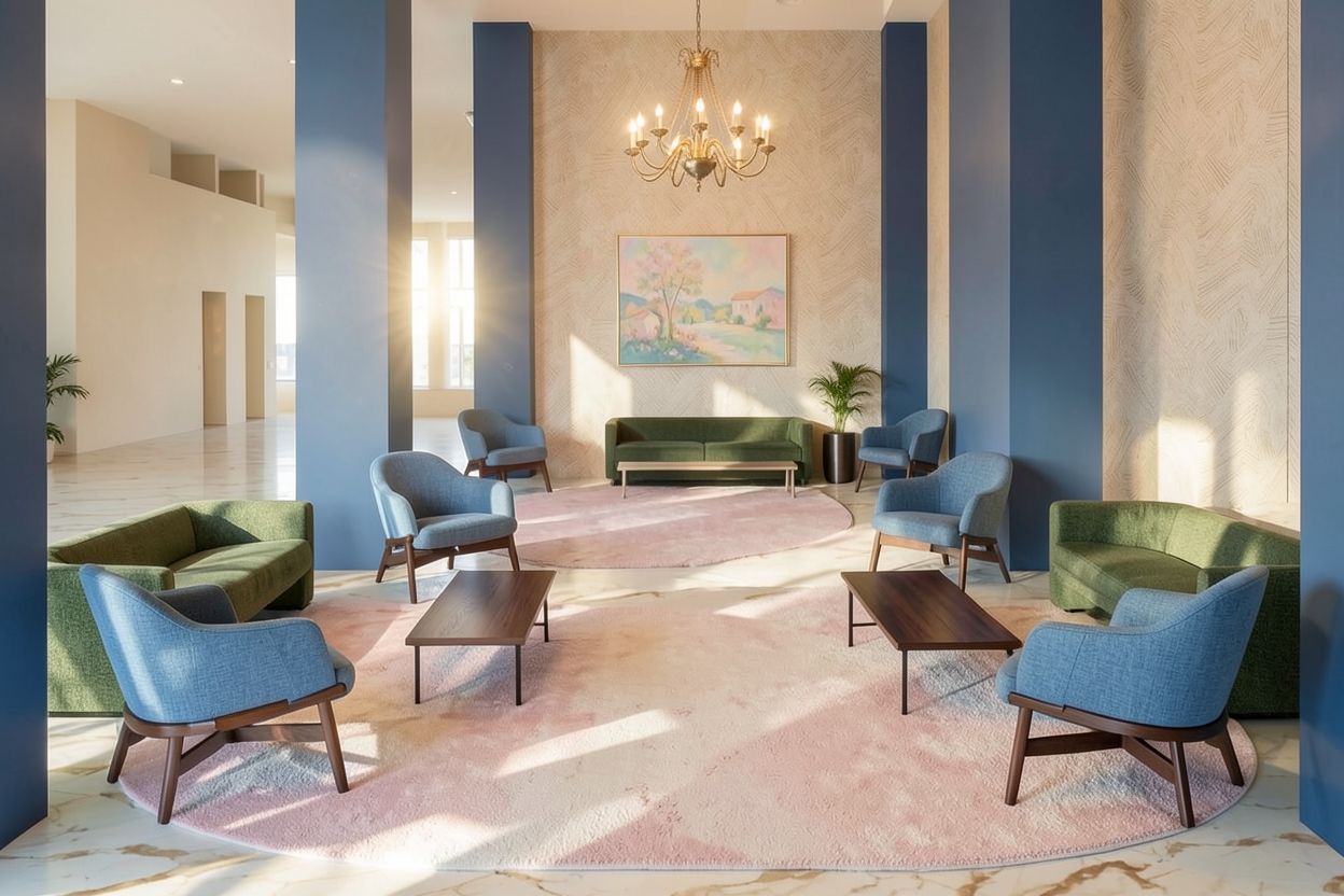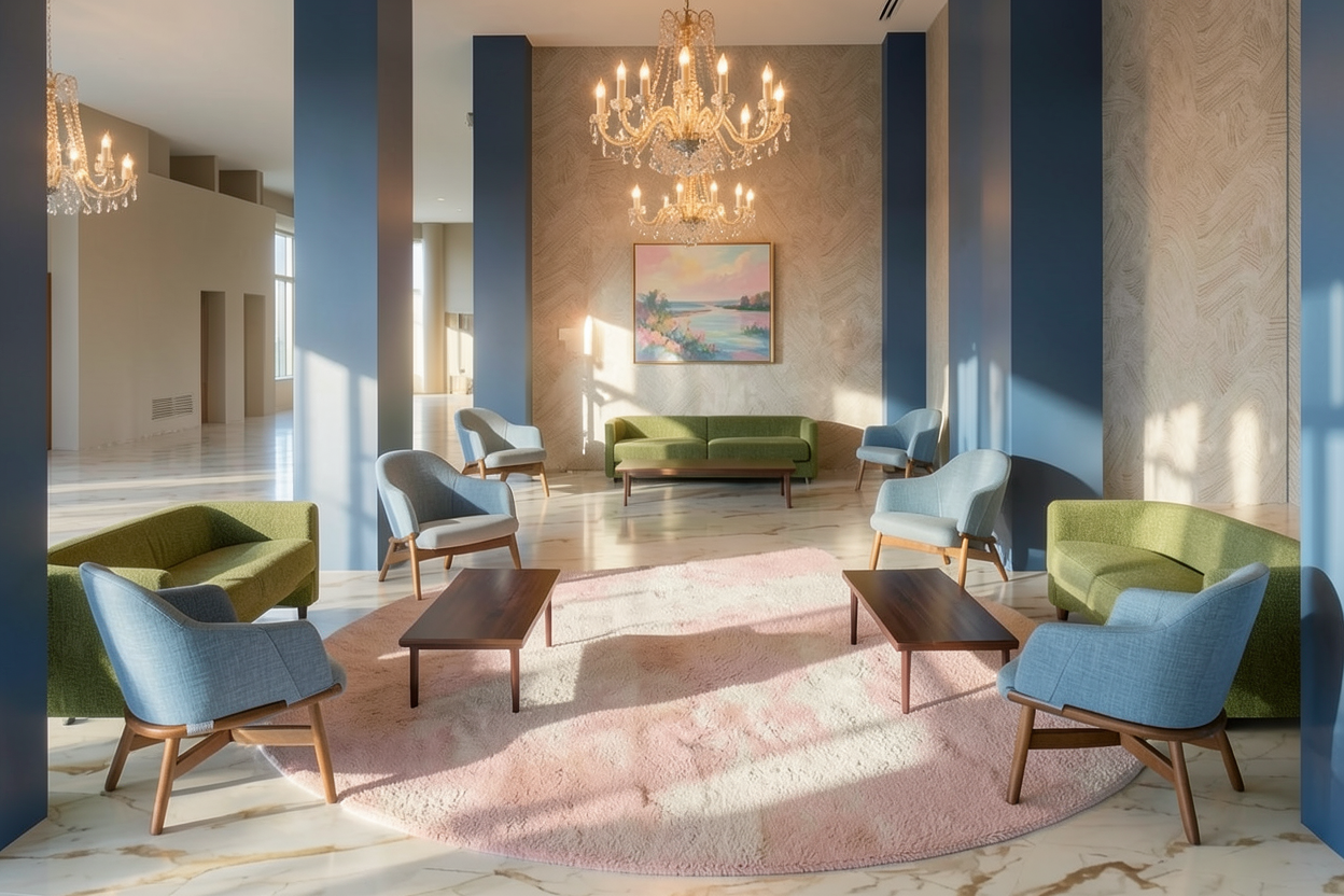 while keeping the same proportions and colors same blue chairs same green couches same blue columns same wallpaper make a photorealistic picture of this lobby area for a hotel add realistic fabric textures to the chairs and couches make the wood coffee tables and wood legs of the chairs a dark chestnut wood add a pastel painting on the wall behind the back couch add one chandelier over seating area the front and back one the chandelier should have soft warm lighting add a circular pink almost beige white rug under each of the three couches there is soft sunlight coming from behind the camera