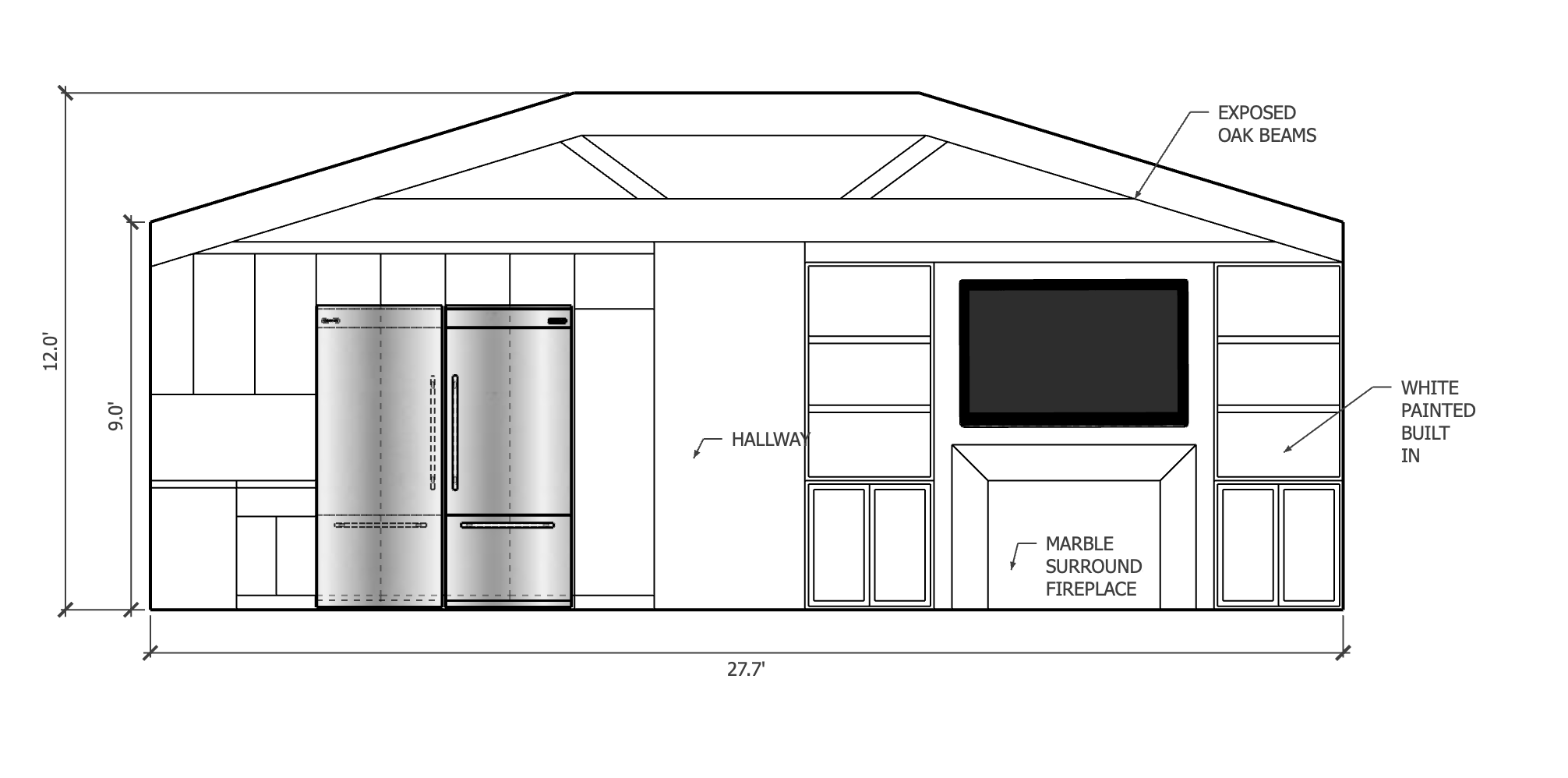 interior shot match exactly to the sketch there is a 3 5 wide hallway between the kitchen and family room built in this hallway is only 5 deep put a piece of art on the wall at the end of the hallway the cabinet door to the left of the refrigerator should be closed ans the same white style as the other cabinets