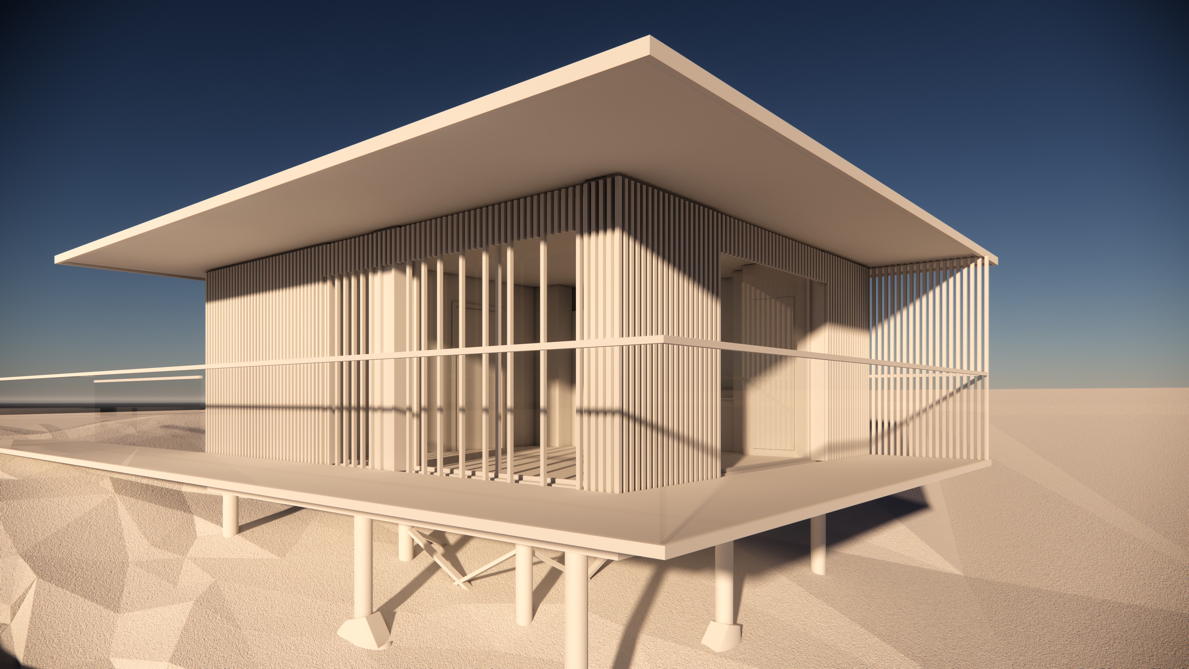 cladding is dark black floor is black ceiling is light wood foundation are black