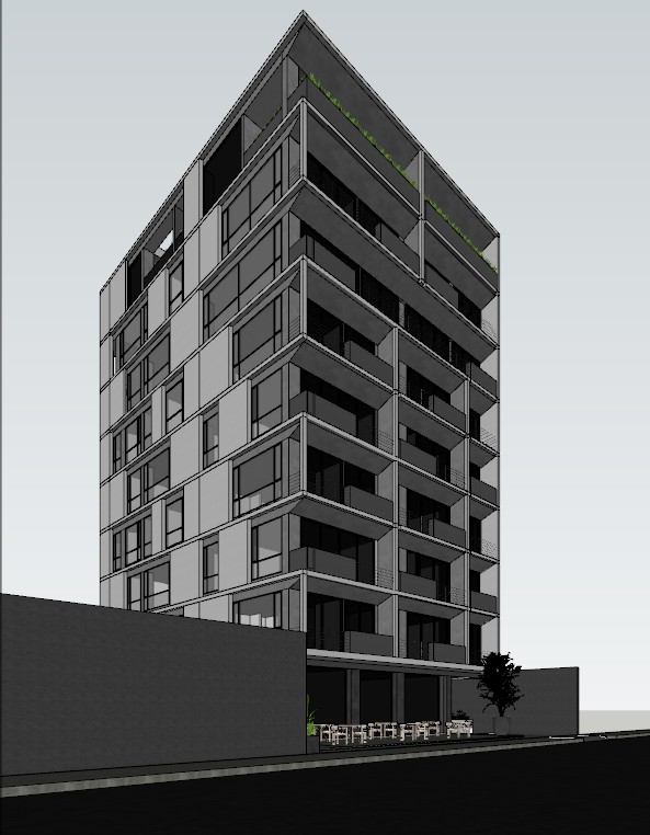render a modernist architectural building with sleek angular lines use a palette of light gray for the concrete deep charcoal for the window frames and reflective glass the building should stand in an urban landscape with a clear blue sky and warm sunlight to create a bright and inviting atmosphere add subtle shadows for depth and dimension highlighting the building s geometric design