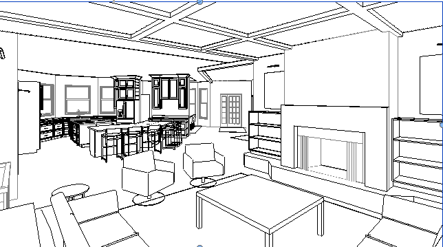 render this living room with wood bookshelves and fireplace surround and white kitchen cabinets in the background
