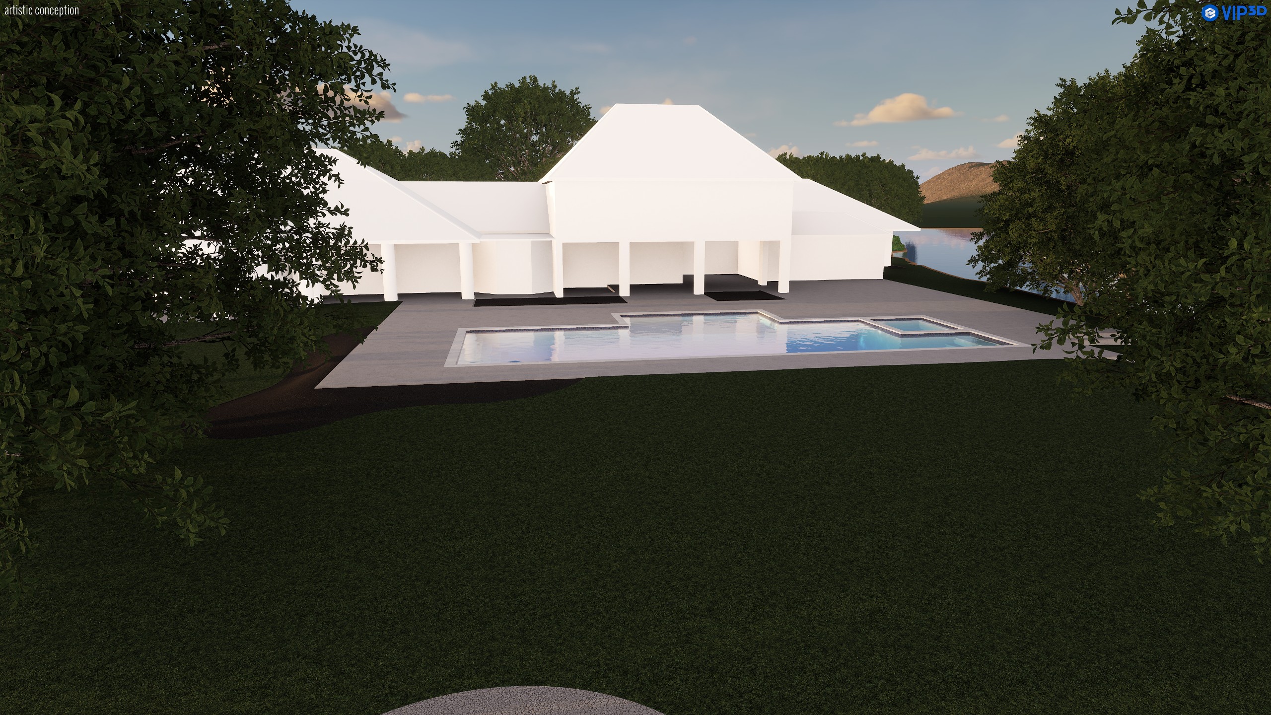 low hedges in landscape areas around pool preserve view of lake in background maintain pool exactly as is in images white limestone pool deck material