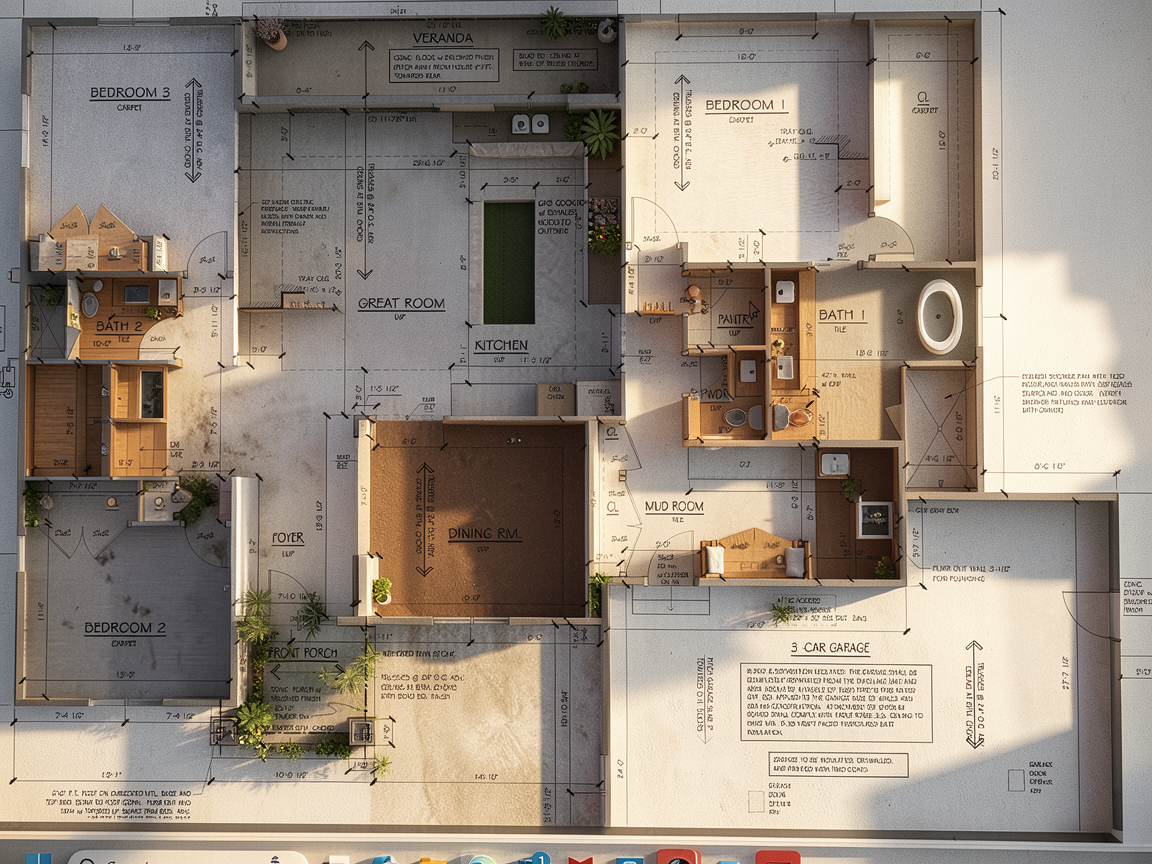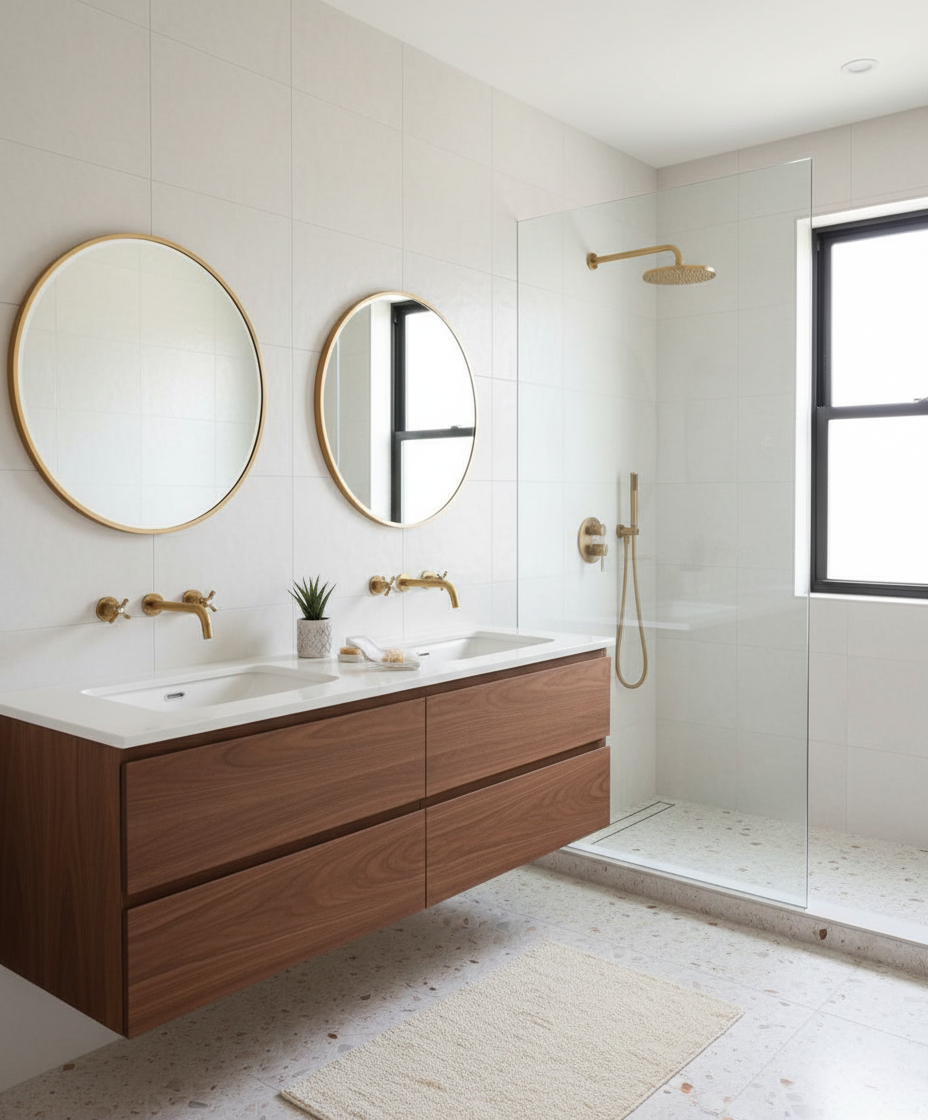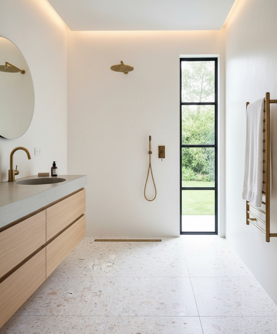 make a modern bathroom with brass tap ware the floor tile must be the terrazzo that is featured in all three of these photos the image should be from a top down view