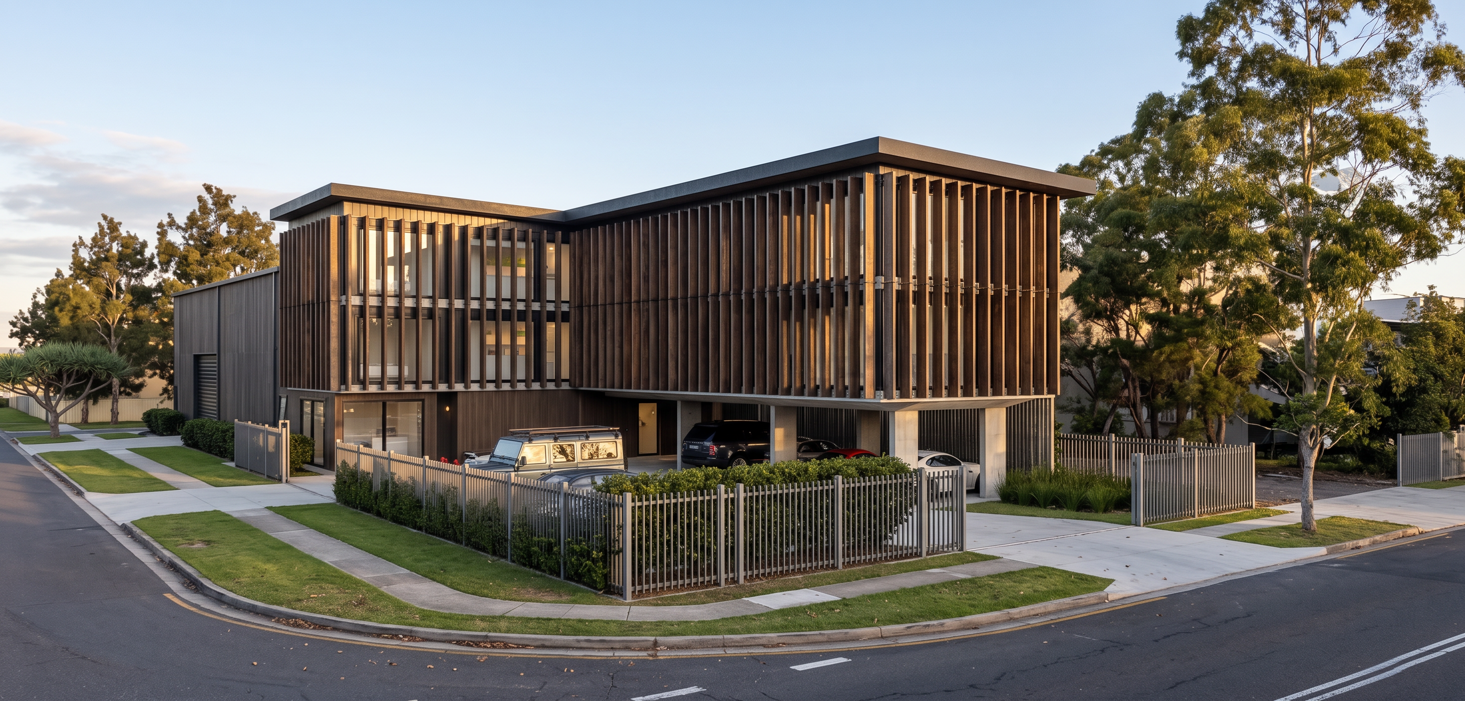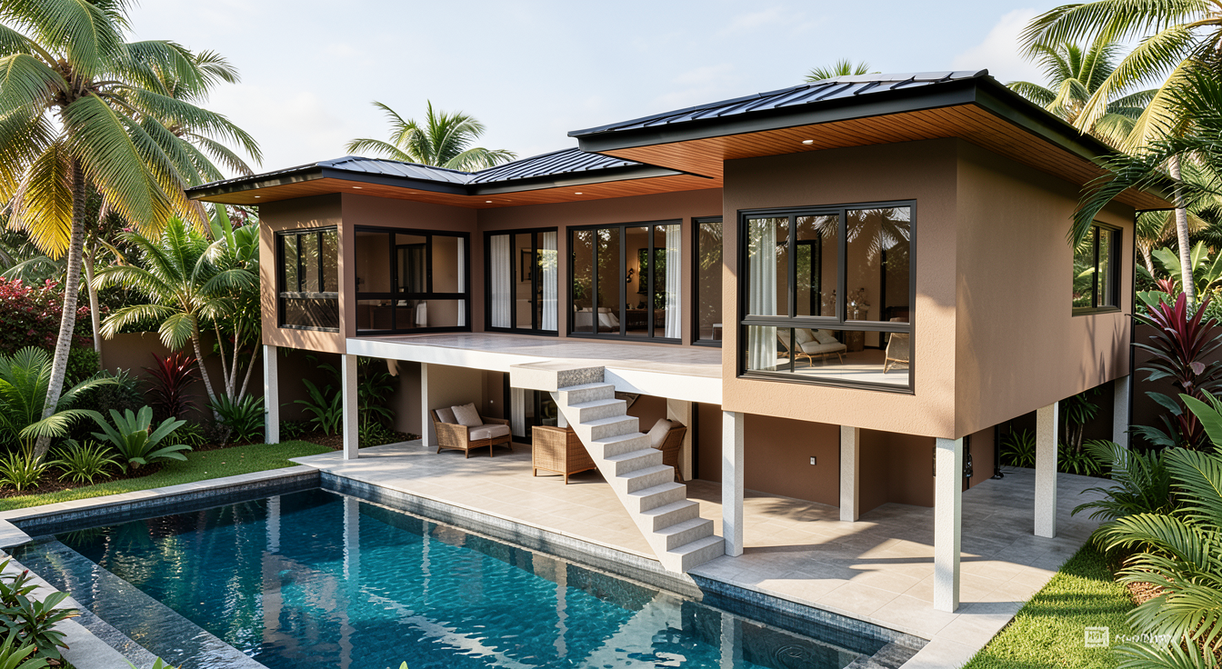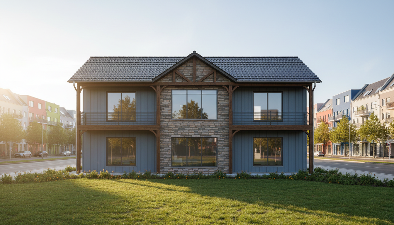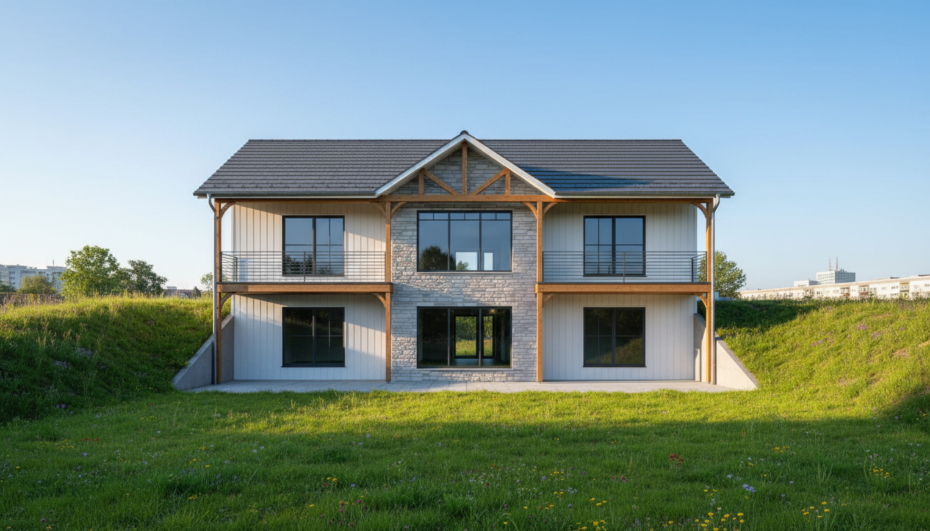 modernist wide angle shot focus on a walkout basement on a sloping lot with oak and maple trees and make the wooden accents stand out with black grids in windows change the colour to look like a modern farmhouse add a sloped lot and the basement is a walkout architecture