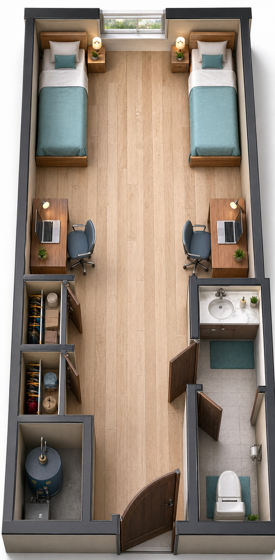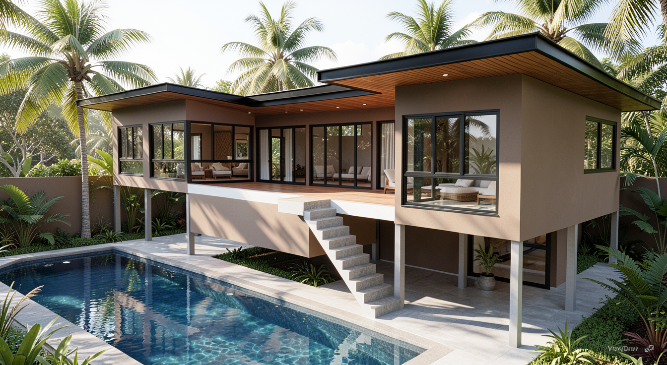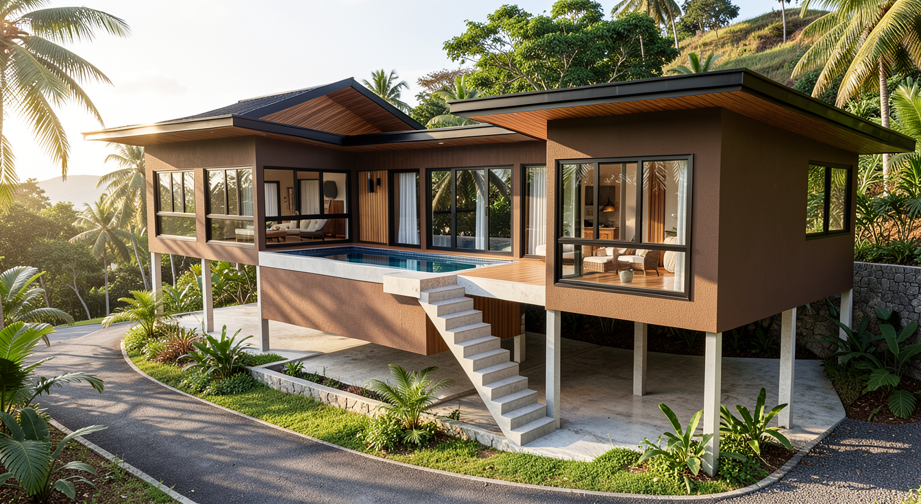 modernist wide angle shot focus on a walkout basement on a sloping lot with oak and maple trees and make the wooden accents stand out with black grids in windows change the colour to look like a modern farmhouse add a sloped lot and the basement is a walkout architecture