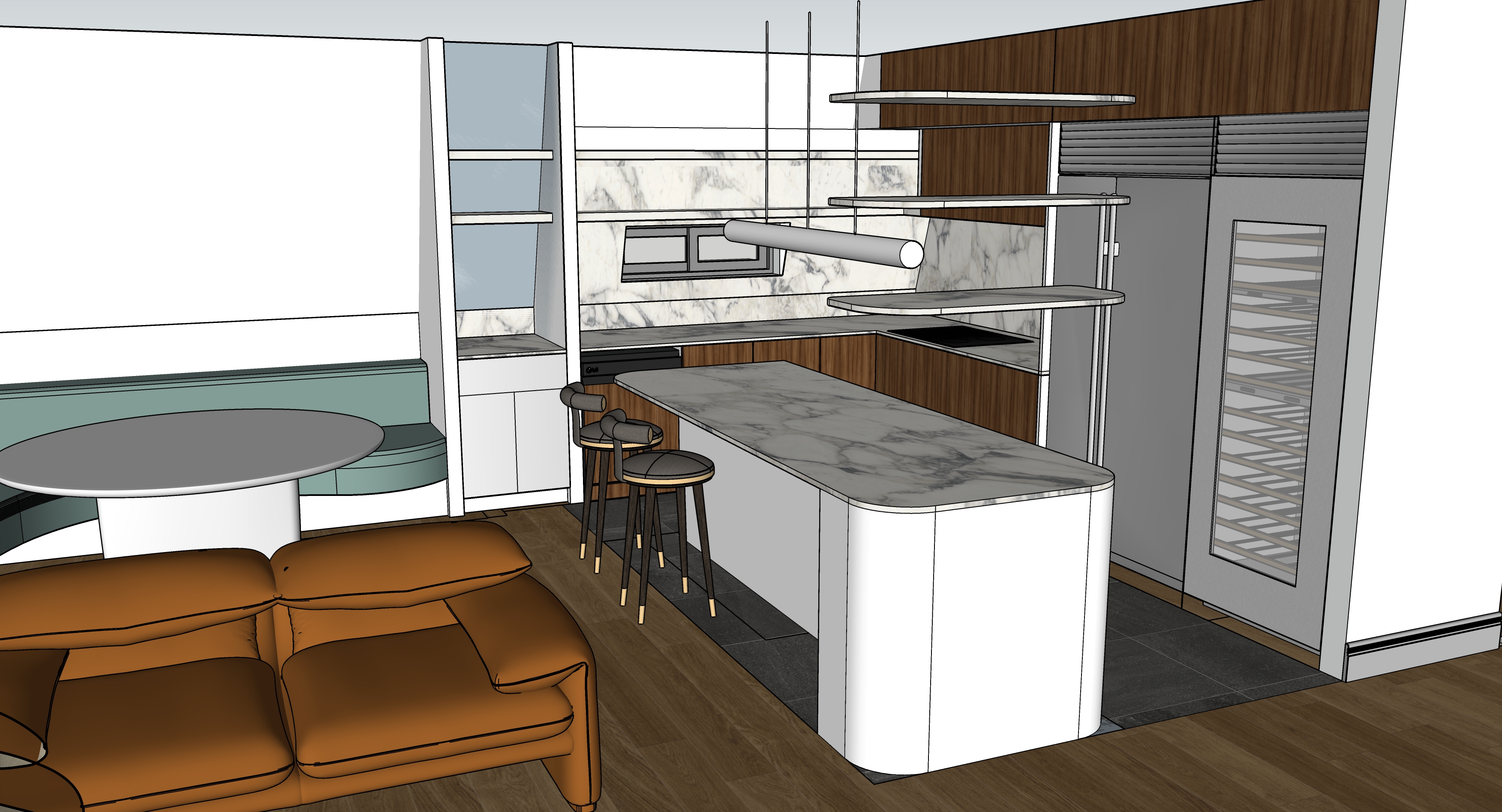 warm white kitchen with a luxurious and serene kitchen featuring walnut kitchen cabinet doors adorned with marble countertops accented by elegant brass hardware and stainless steel appliances the atmosphere is calm and inviting with abundant natural light on a sunny day