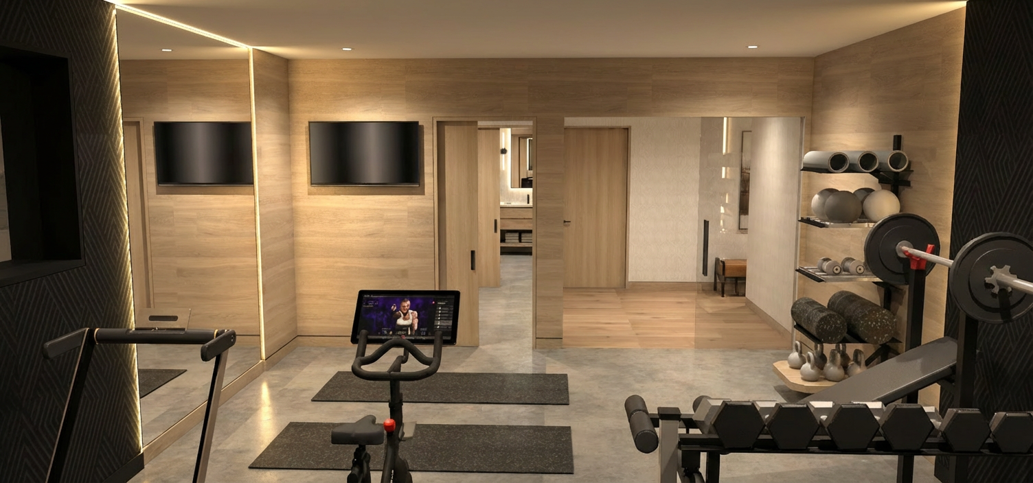 enhanced interior lighting undermount sink set into countertop in the bottom left with a brass faucet mirror above the sink and faucet medium opaque white spherical sconce on either side of the mirror with slim small circular brass backplate white oak cabinetry countertop is white quartz brass shower controls and showerhead beyond glass on back wall of shower medium brown natural wood door and trim same shower tile on floor same shower tile as backsplash below mirror