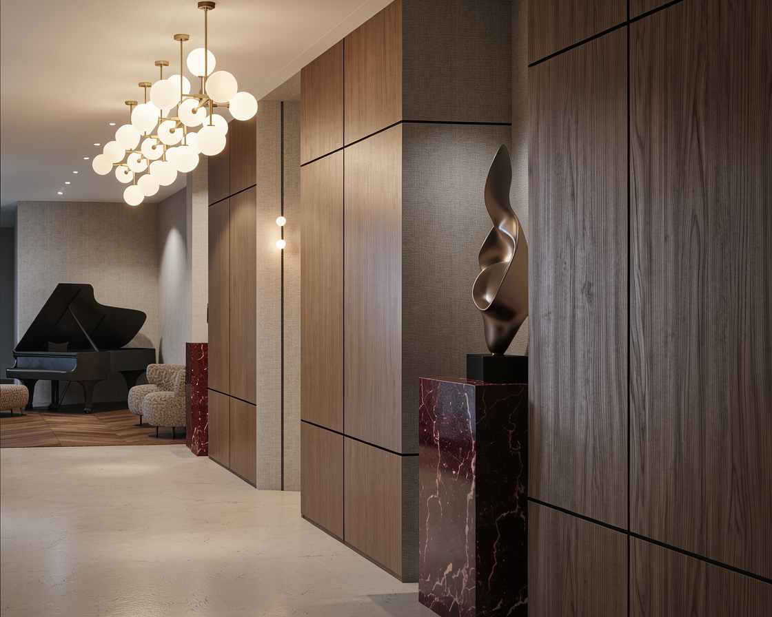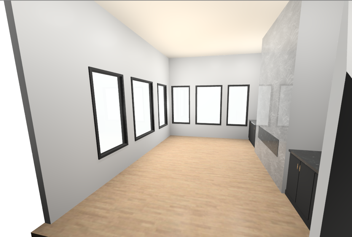 exterior shot make the sofa long on one wall with two ottomans