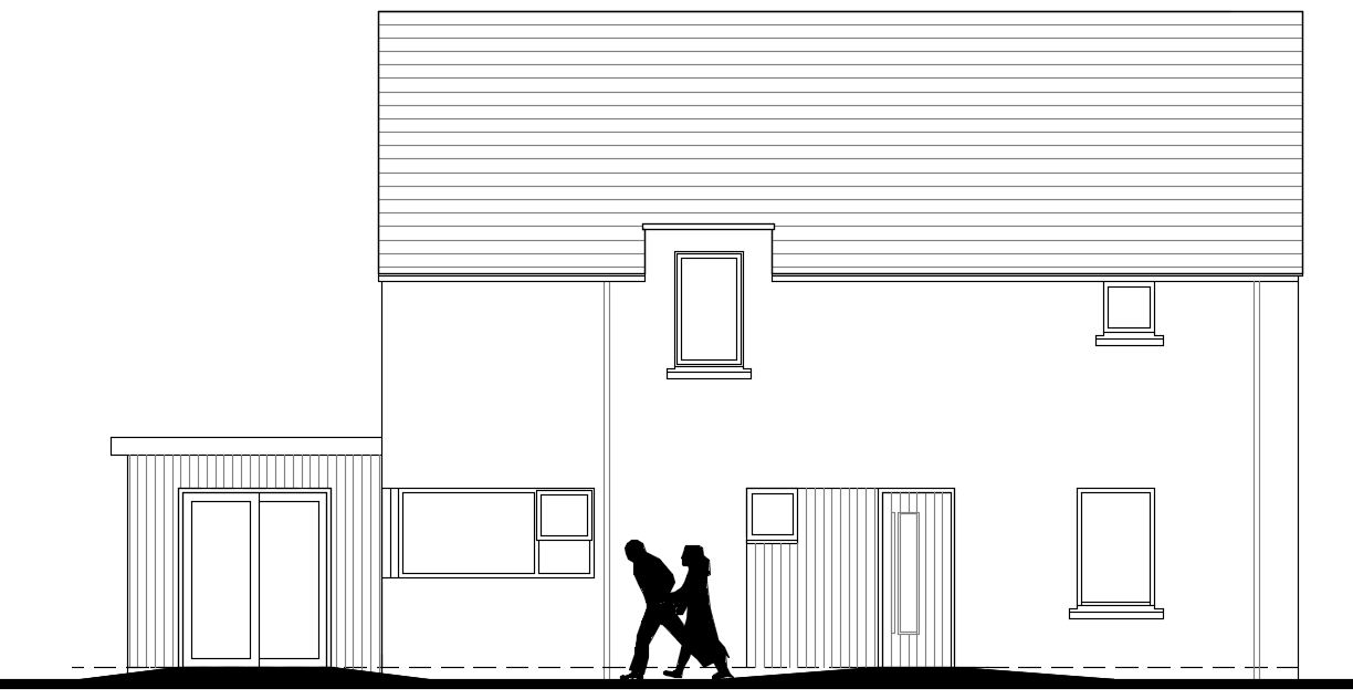 a charming modern house exterior surrounded by lush greenery the house features a soft cream facade with charcoal coloured wide plank charred larch vertical timber accents on the extension with double patio doors and recessed panel around front door the roof is a calming slate blue large windows reflect the clear blue sky the front door is a welcoming deep forest green the atmosphere is serene and inviting with a warm golden sunset casting a soft glow over the scene two silhouettes walk past the house dressed casually adding a sense of life and movement