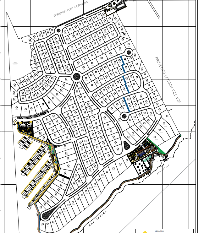 a 3d visualisation of this city give each lot a house and a garden render the beachclub at the beach the port and the port club