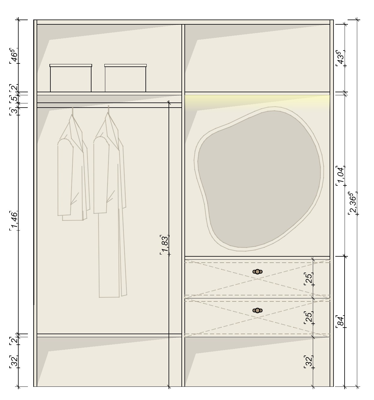interior shot minimalistic open wardrobe with open shelves and organic shape mirror hotel style with atmospheric warm light and led illumination above the mirror clean and modern very elegant look bronze knobs on the drawers