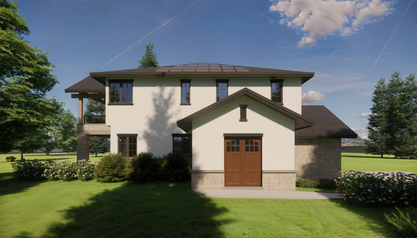 create a stunning realistic rendering of a modern suburban house the walls are a soft ivory with light gray stone accents the roof is covered in dark slate tiles windows and door frames are sleek black the front yard features a lush green lawn with neatly trimmed hedges and small trees the sidewalk and driveway are a light stone color the sky is a clear pale blue with a few fluffy white clouds the atmosphere is serene and inviting capturing an ideal sunny day in a tranquil neighborhood setting