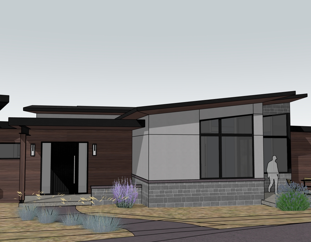 the rendering is of the entry facade of a contemporary home on a sunny clear sky day with a background of scattered ponderosa pine trees the entry features a wood post supporting a steel beam with a black steel entry door with a full length window on each side contemporary wall sconces are on either side of the windows the entry roof features a steel beam supported by a wood post exterior materials are a light grey stucco with joints to match the image dark grey wall tile with joints that match the image horizontal wood siding with a dark brown stain there is a sidewalk leading to the front patio with wood mulch landscaping on both sides and small plants scattered in the landscaping all materials should match the image as closely as possible