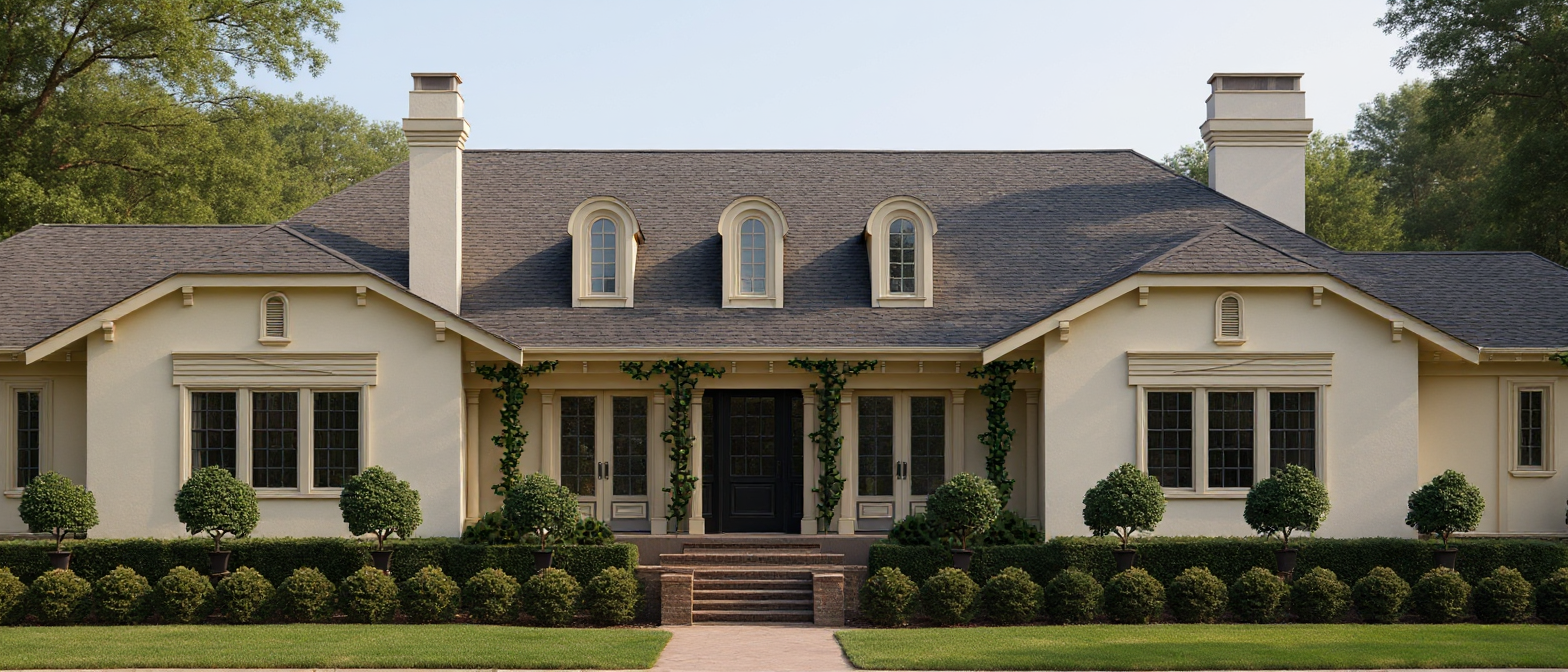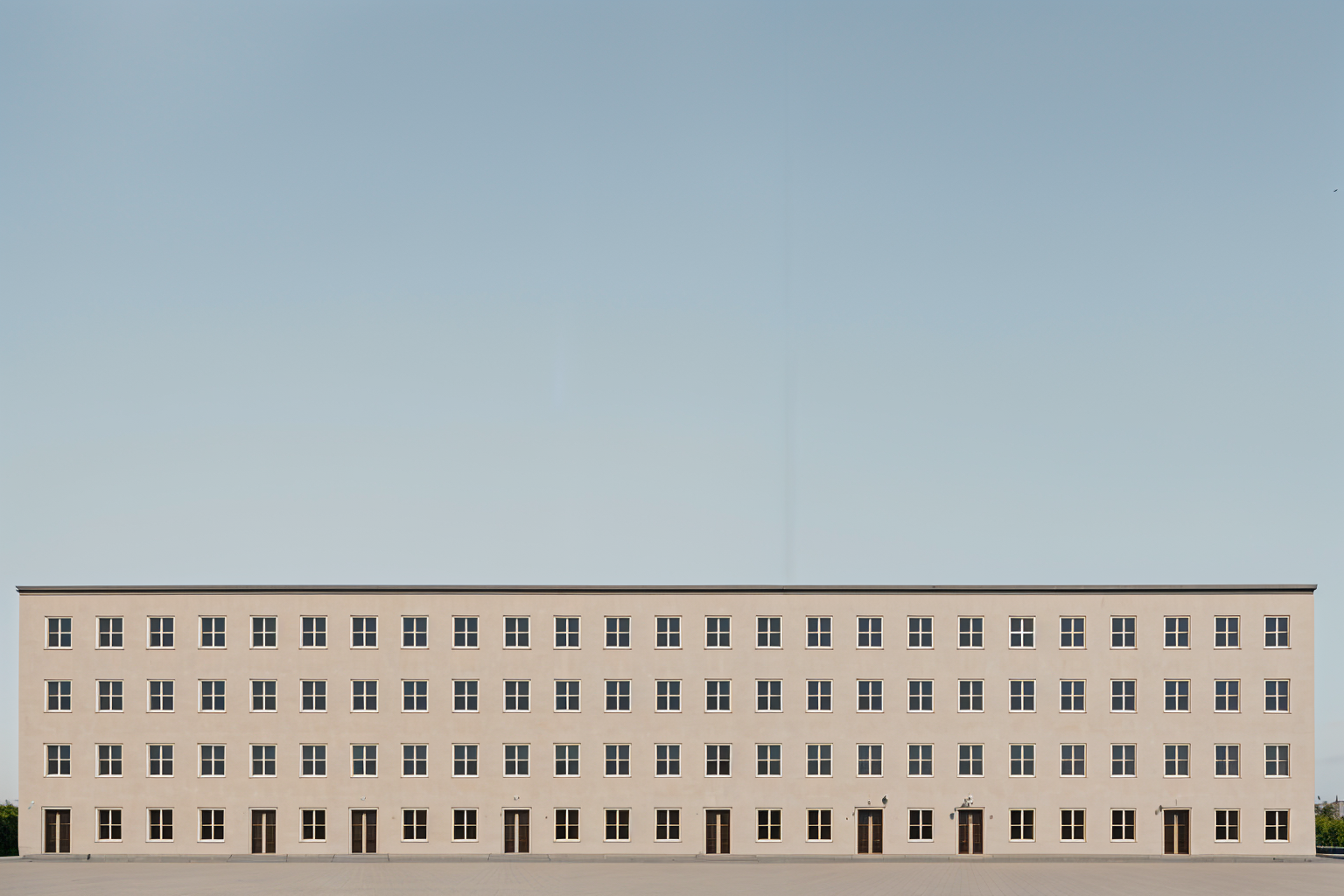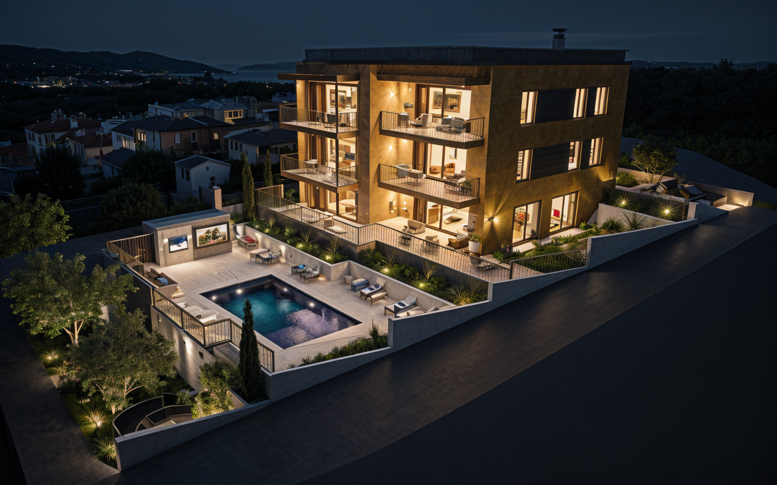 nicholas grimshaw night shot medireranean village background olive trees and aloe veras and thujas in garden french interiors in windows brass vertical stripes railings rolf benz furniture grey window frames white facade grey pieces of facade change tobrass white marble pavement shining blue mosaic pool in front of every balcony two randomly distributed floor to floor vertical striped brass panels 80 by 320 cm architecture