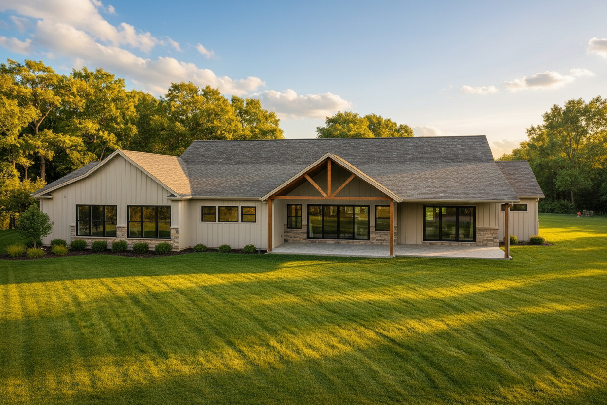 keep the archie and stone change the main paint color to a white make the window trims blue and the roof trim a dark blue grey