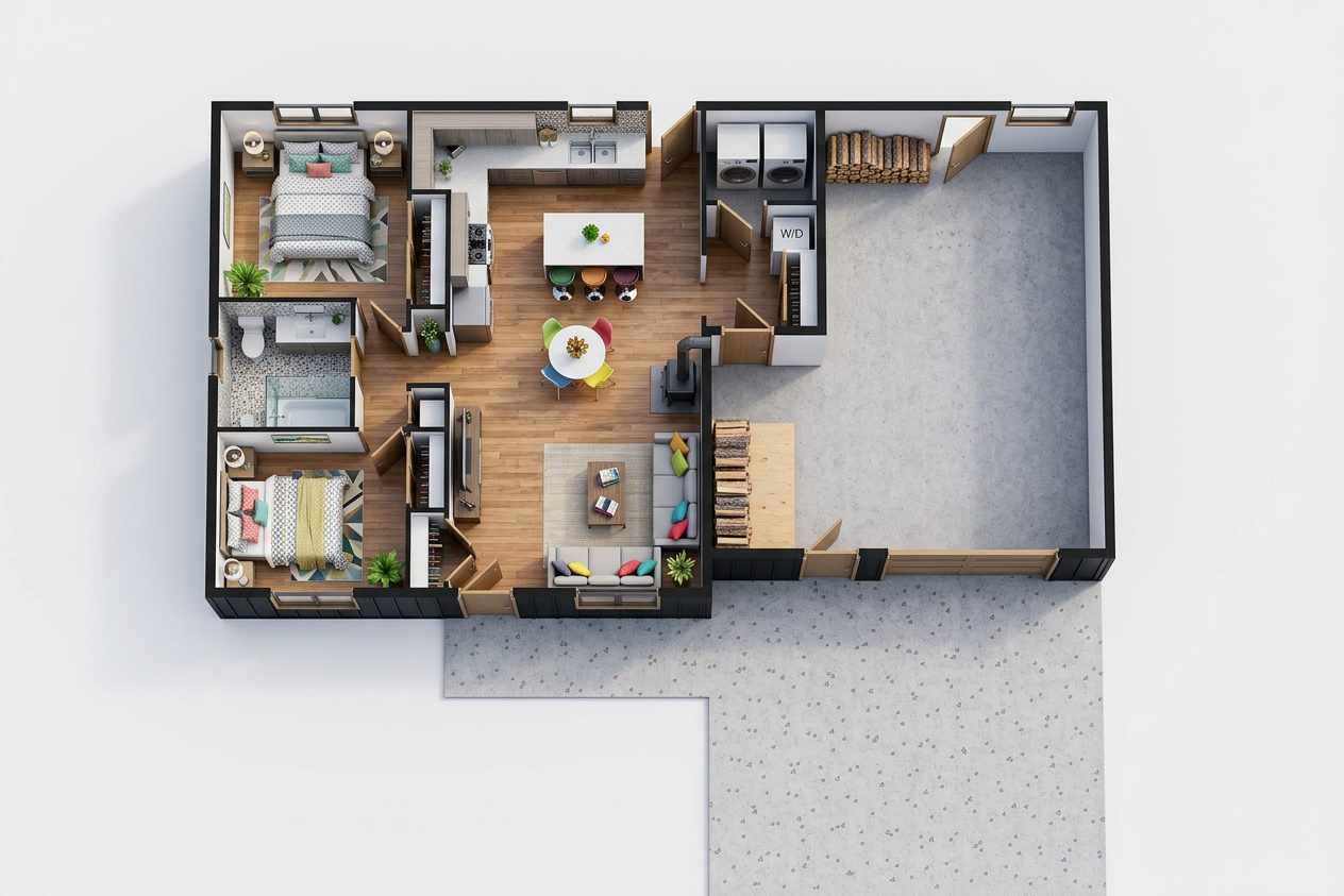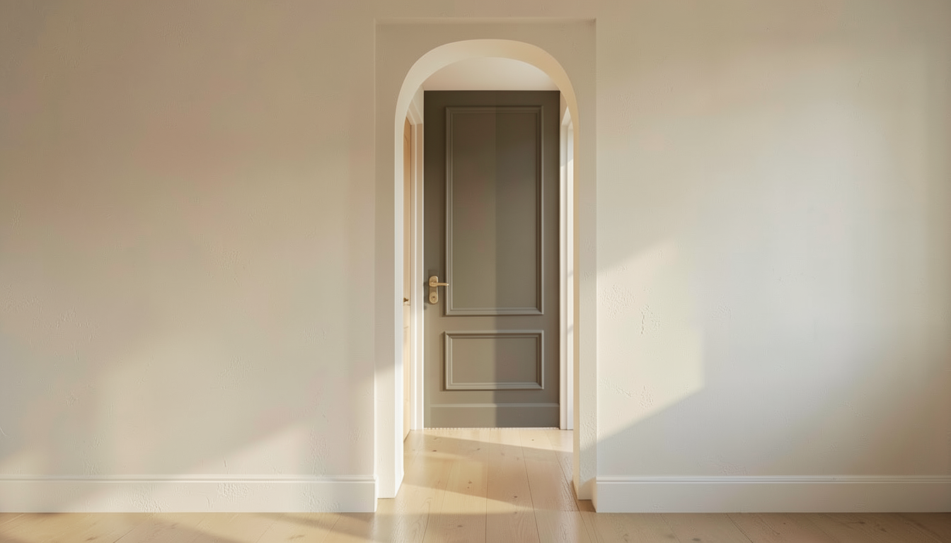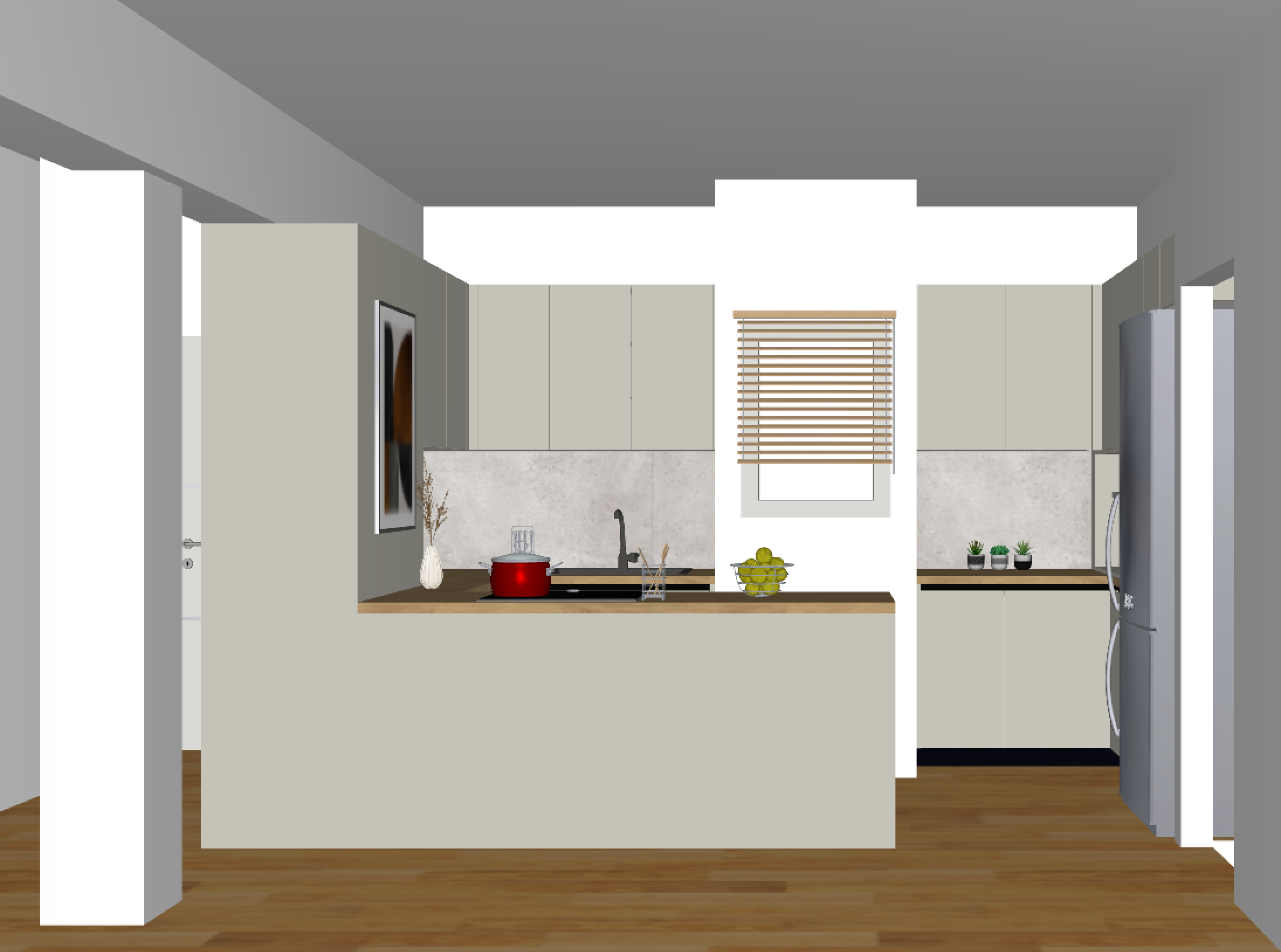 a modern kitchen with a minimalistic design the walls and cabinets are painted a soft beige color providing a warm inviting contrast to the cool gray ceiling a light gray stone backsplash complements the sleek matte black sink faucet perfectly the countertop made of rich wooden tones adds depth and texture the kitchen features a stainless steel refrigerator on the right enhancing the contemporary feel on the counter a bright red pot sits next to a clear glass blender adding vibrant splashes of color a decorative bowl of green apples contributes freshness and vitality the wooden floor maintains a consistent harmonious look with warm brown hues soft natural lighting creates a cozy atmosphere perfect for a stylish urban apartment