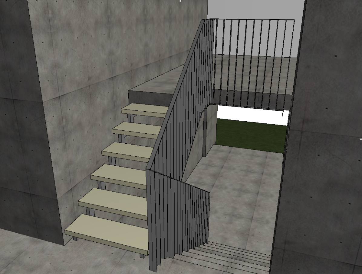 make this picture realistic walls are white floor is oak parquet stairs are fiber coir and handrail is polished white steel