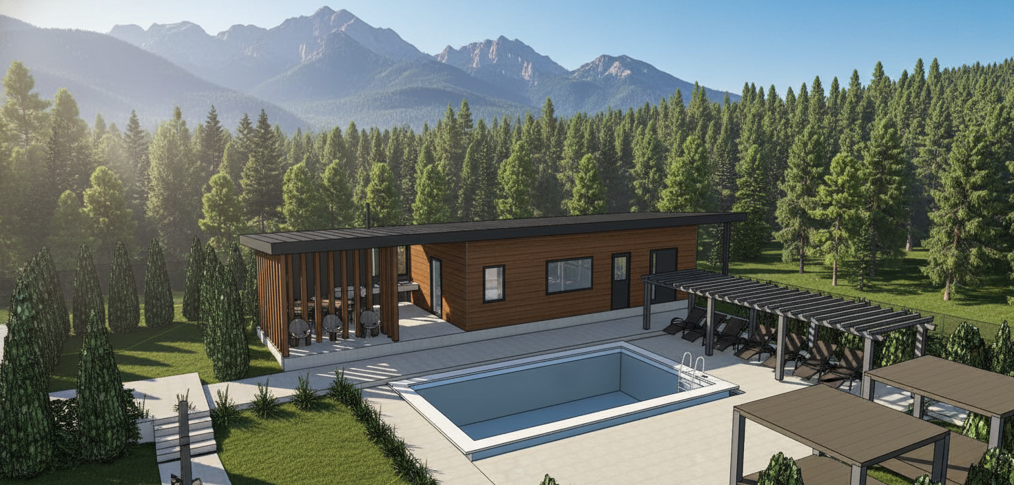 barndominium exterior shot houses in a forest in mountain sunny morning black metal roof black windows black doors wood accent and wooden finishes water in the pool architecture