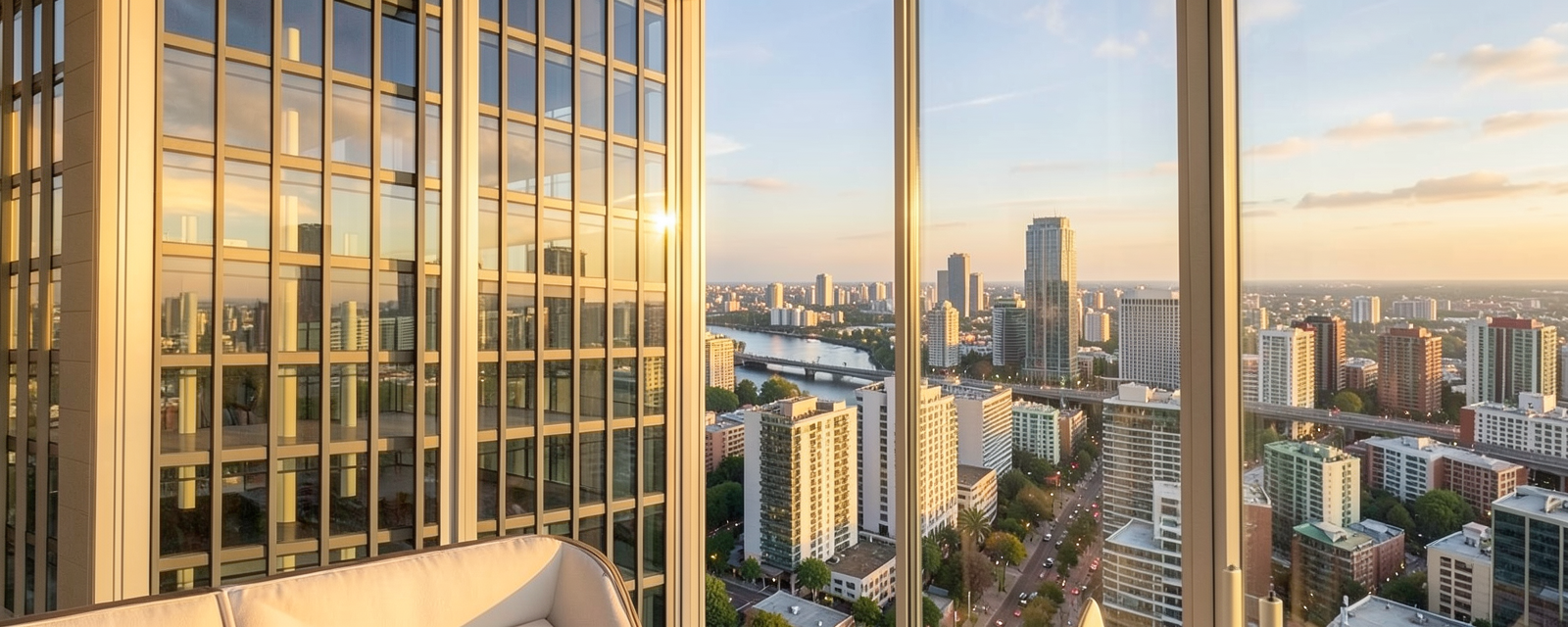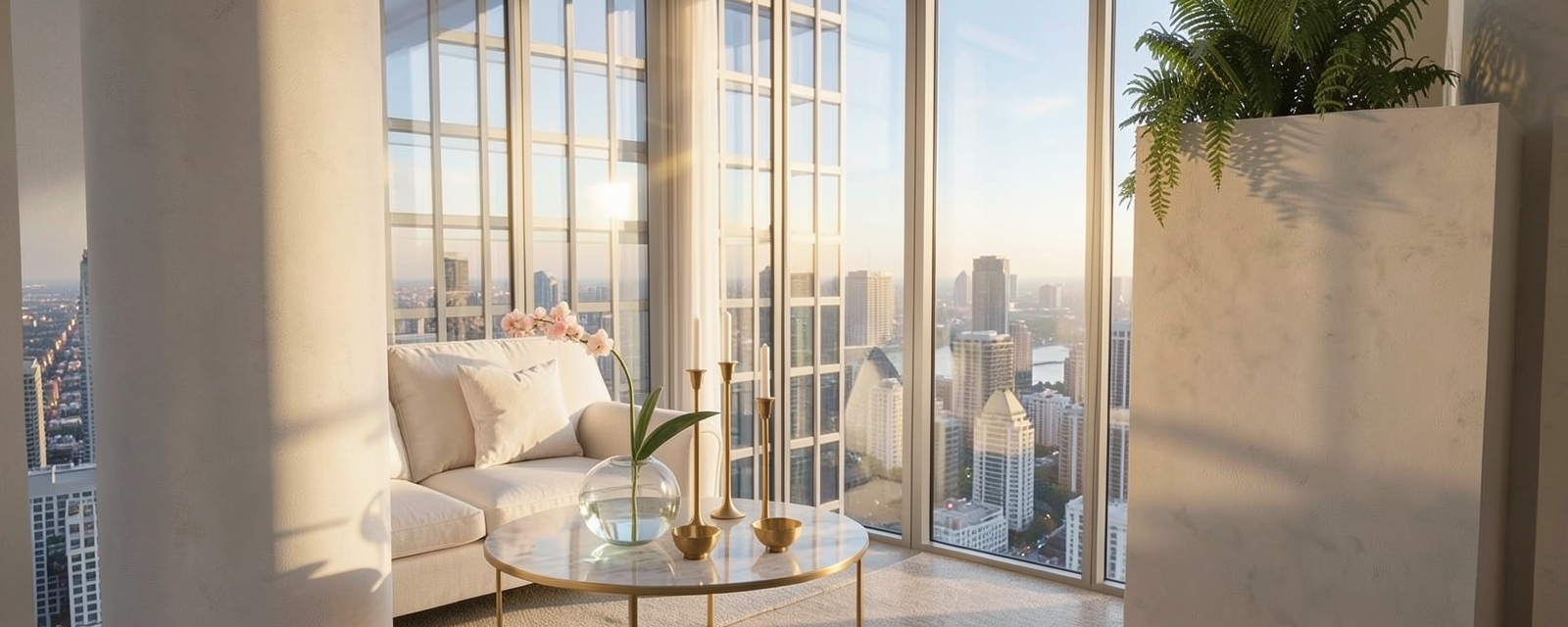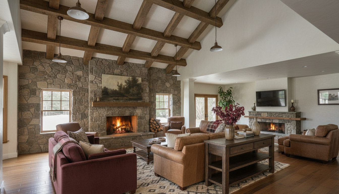 a modern kitchen interior with an inviting and cozy atmosphere the cabinets are a deep forest green color contrasting beautifully with the cream colored upper cabinets the kitchen island is crafted from light oak wood with a litgh gray countertop stainless steel appliances including a fridge and dishwasher add a sleek contemporary touch the ceiling features rich dark wooden panels with modern pendant lights hanging gracefully the dining chairs are upholstered in a soft pastel pink fabric the floor is a check pattern light greige and bianco tiles large windows allow natural daylight to flood in complemented by sheer white curtains a touch of greenery from a potted plant adds freshness to the space the overall ambiance is warm and welcoming with a blend of rustic and modern design elements