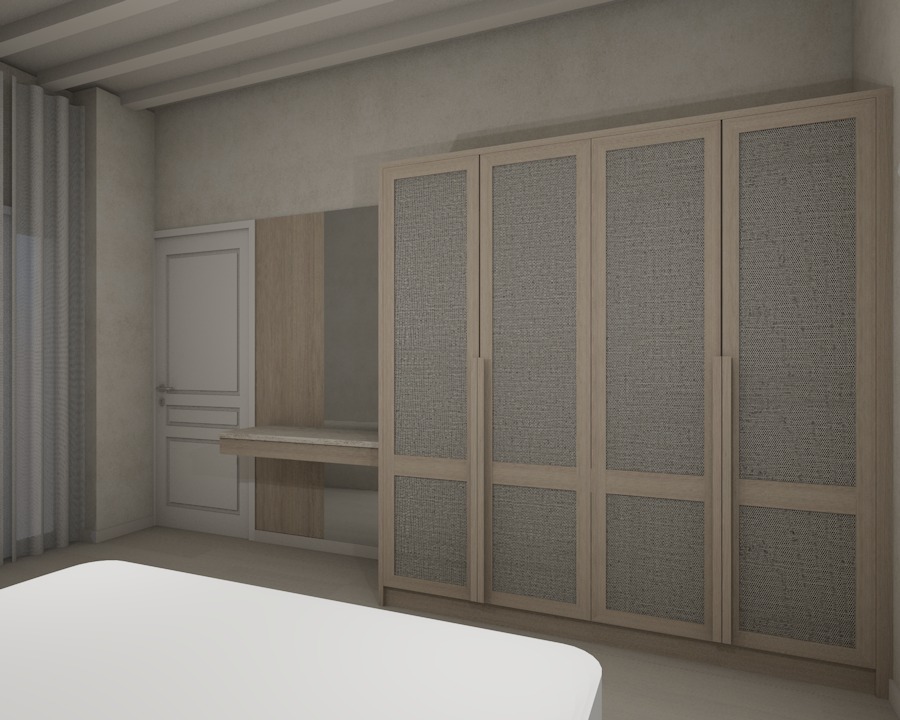 create a highly realistic render of an interior bedroom with a calm atmosphere ultra realistic render high resolution professional interior design photography style keep the design exactly as it is travertino counter the walls are light beige cemento effect keep exatly the same texture in the wardropes the curtains are white linen and the view is blur style the bed light champagne oak wood ont the furnitures
