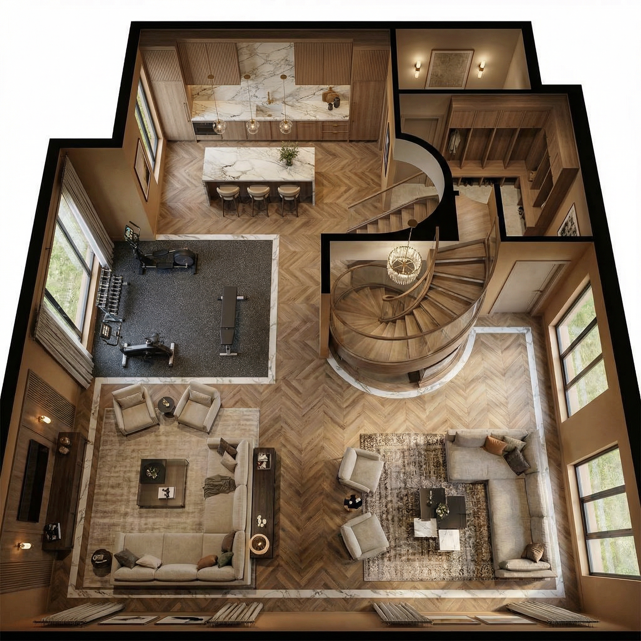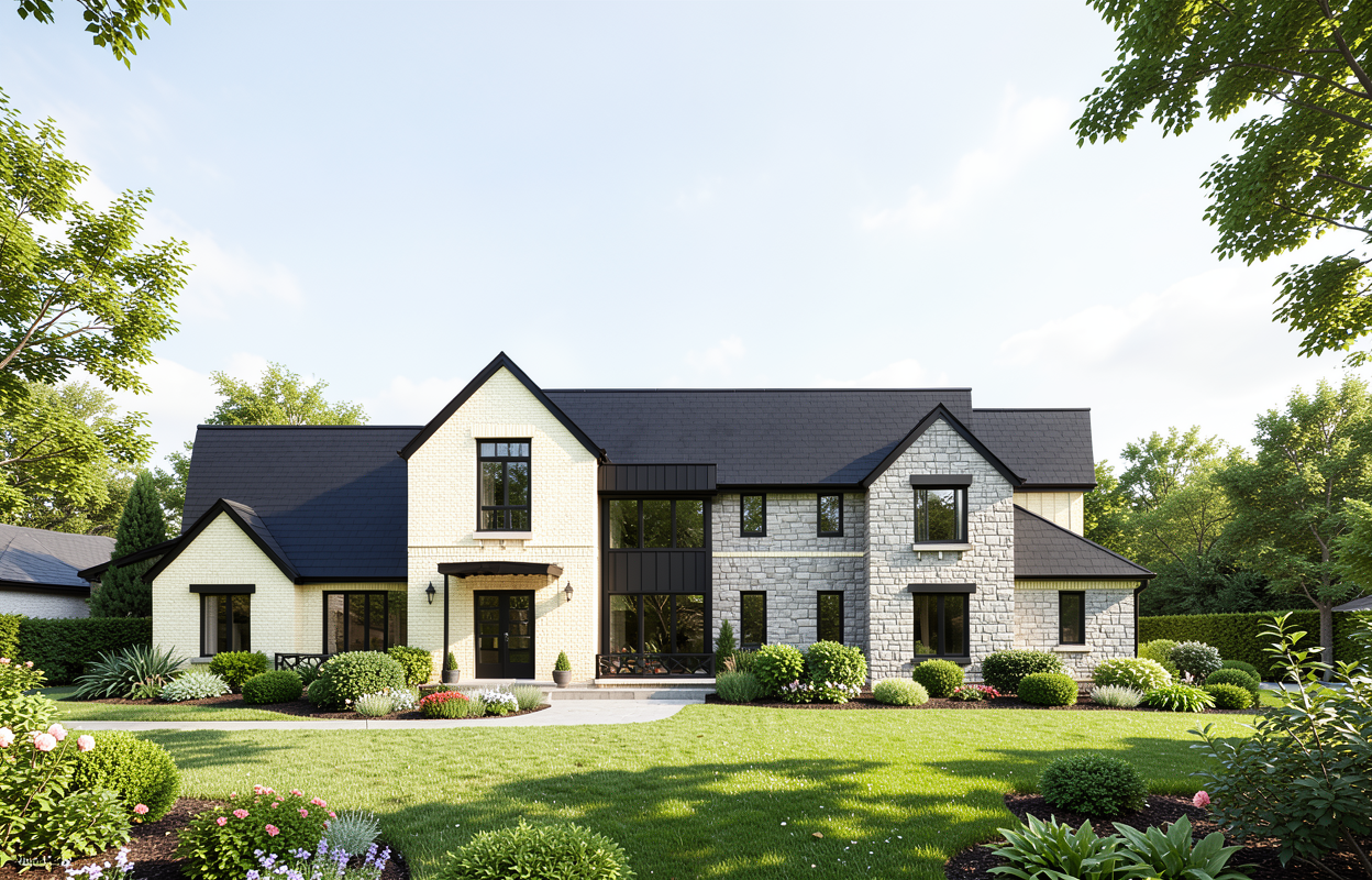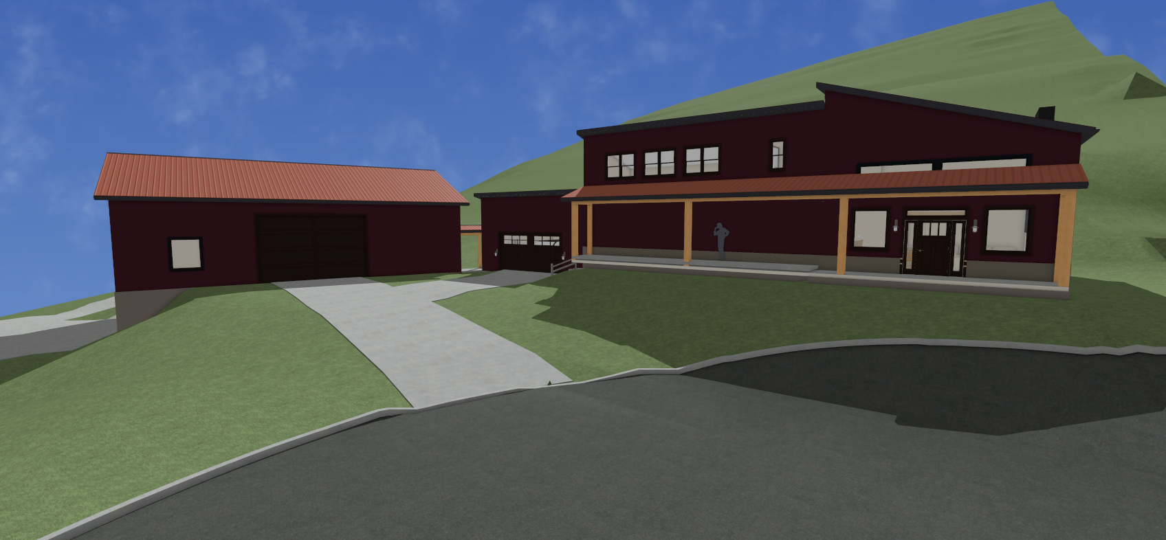 ultra realistic architectural visualization of a modern barndominium style home on a sloped hillside surrounded by a dense lush forest the main house is a two story structure with deep red siding and black trim featuring a long covered front porch supported by natural wood posts the porch spans across the front fa ade with concrete steps and a raised platform large rectangular windows with white frames are evenly spaced on both floors the main entry door is centered with sidelights attached to the right side is a lower garage volume integrated into the house to the left a separate detached garage building matches the same red siding and metal roofing connected by a wide light gray concrete driveway that slopes gently upward both buildings have standing seam metal roofs in a muted earthy tone the terrain is a grassy hillside with smooth grading and natural slopes in the foreground include a curved asphalt road edge with a concrete curb environment place the entire property within a lush dense forest setting with tall mature trees mix of pine and deciduous rich green foliage layered vegetation and natural undergrowth trees should surround the property while keeping the house clearly visible with depth and atmospheric perspective in the background add subtle forest floor details like shrubs ferns and filtered light through the canopy lighting soft natural daylight slightly overcast sky with realistic clouds gentle light filtering through trees creating soft shadows materials highly detailed textures wood grain posts metal roofing concrete asphalt grass tree bark leaves style photorealistic cinematic composition wide angle lens 24 28mm eye level perspective quality 8k resolution global illumination ray traced reflections physically accurate lighting sharp focus high dynamic range