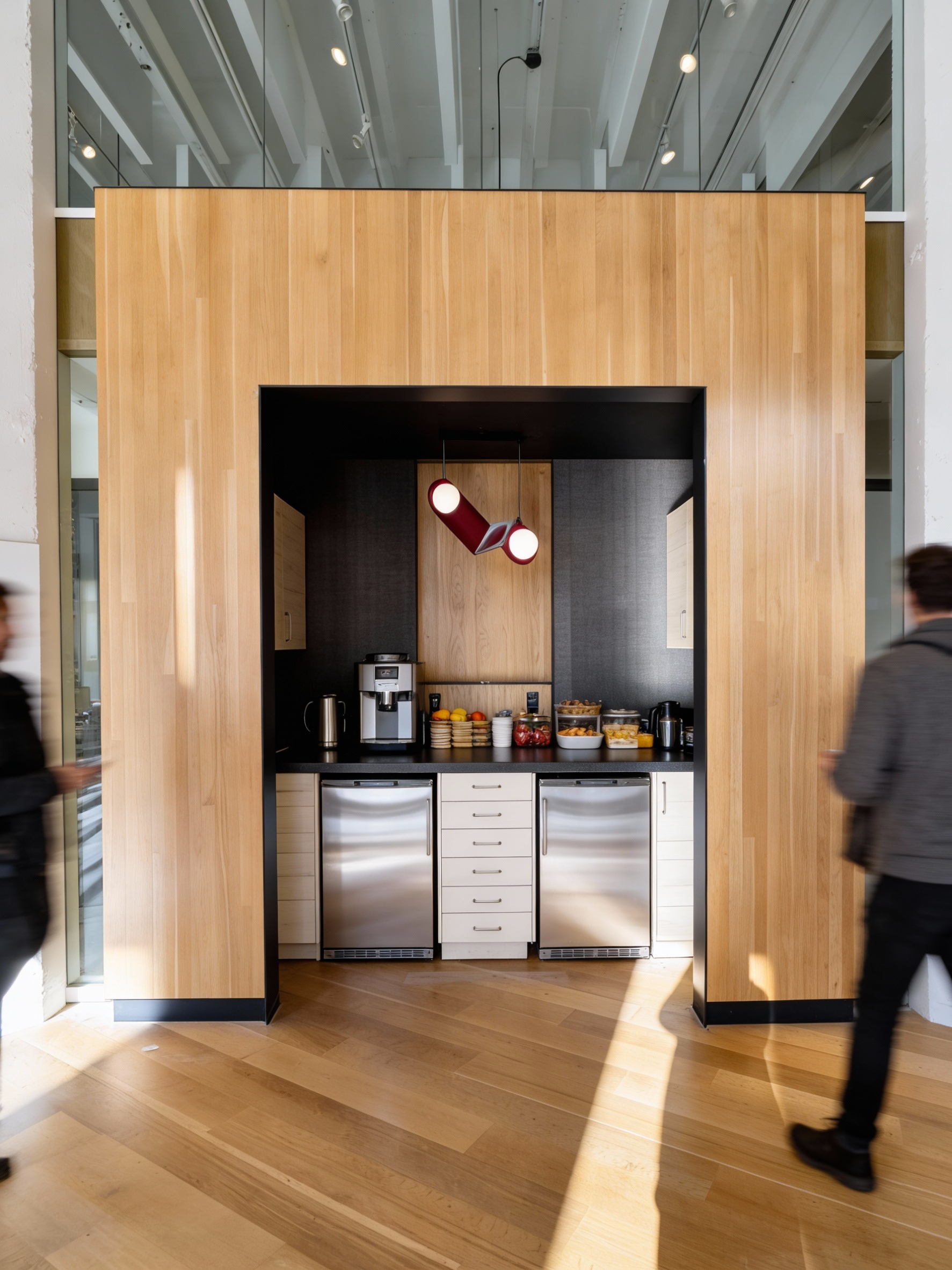 keep all materials the same remove the black outlets from back wall on the wood make the beverage refrigerators have a clear glass door that you can see inside of