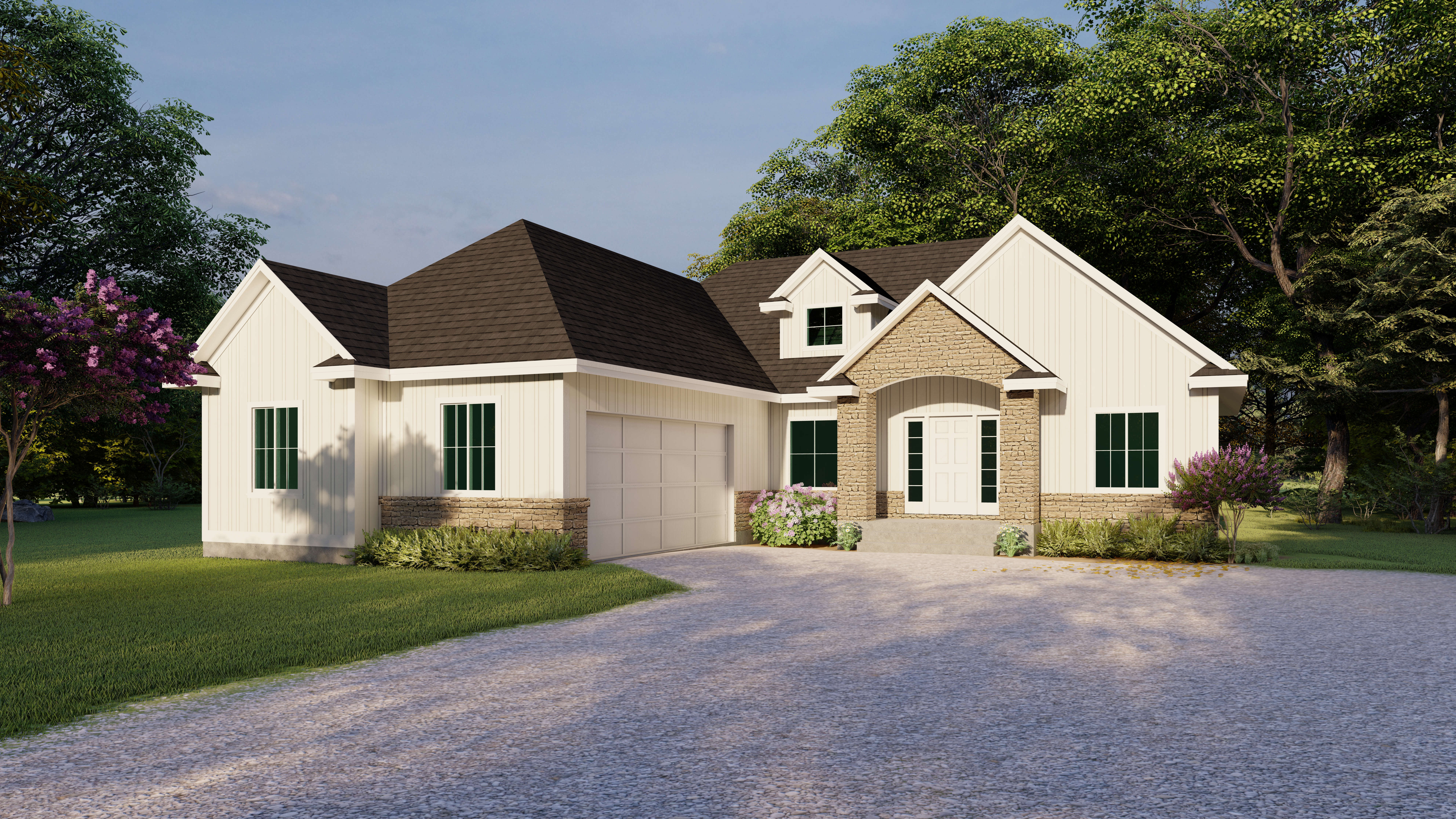 a charming suburban house with a white exterior and a gable roof surrounded by lush greenery the house has a light grey garage door and white framed windows in the foreground vibrant hydrangea bushes with pink and blue blooms are nestled against the well manicured lawn the sky is a bright blue with scattered fluffy clouds the overall atmosphere is peaceful and inviting with sunlight casting soft shadows enhancing the house s crisp lines and fresh colors