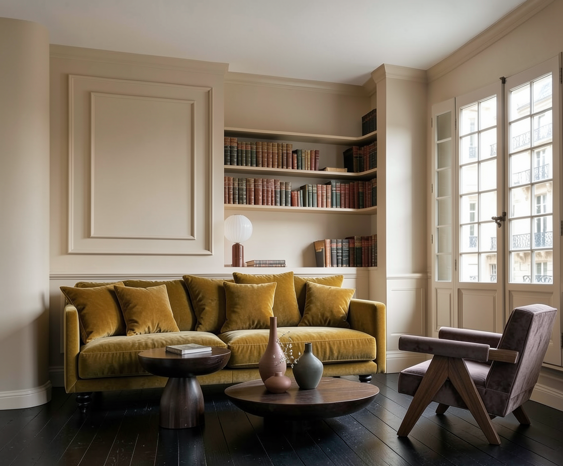 wooden shelve in the kitchen is framing the side of the oven towers too kitchen has a wall light not hanging one burgundy and white floor with less vivid colors from the window view is to an eixample building in bracelona metal profile in bacl chair is aluminium with reflection and black material is black leather walls have and offwhite but more warm tone every light is on and warm there is santa cole lamp reference tekio horizontal on top of the wooden dining table there is no sink tab in the kitchen island no roses on the table dinning chair are original design same as wall light in kitchen wall