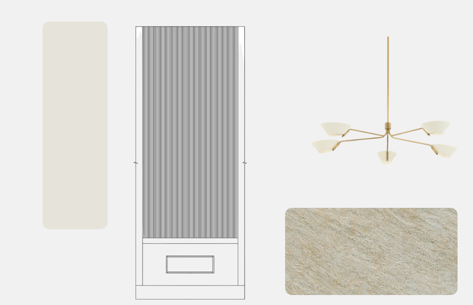create a modern great room with the elevation of the fireplace with painted millwork above and slab mantle surround add chandelier in middle of room draw white oak standard base cabinets on either side of fireplace with shelves above