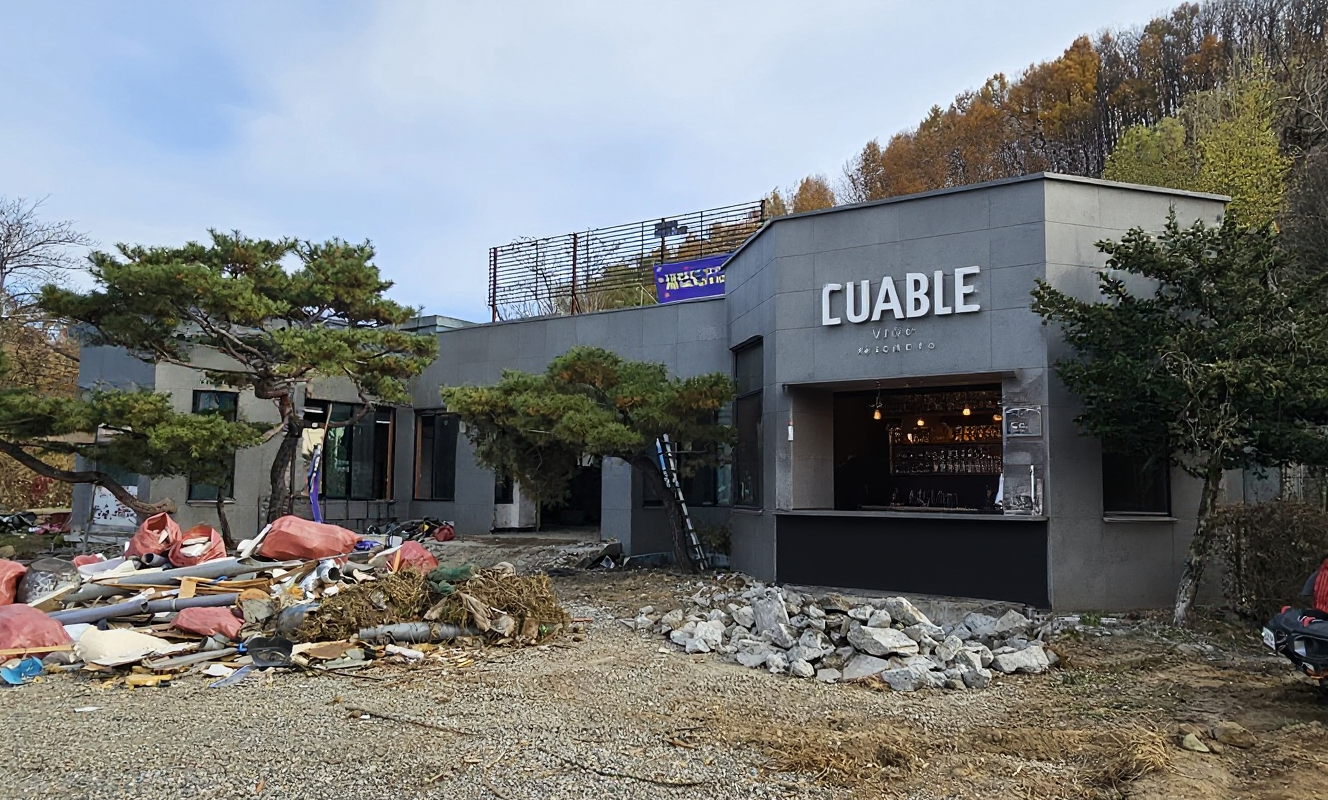 modern style cafe bar counter full wall finish white brick plywood finish on the wall in the middle frame black facade canopy concrete remove the arch removal of the roof