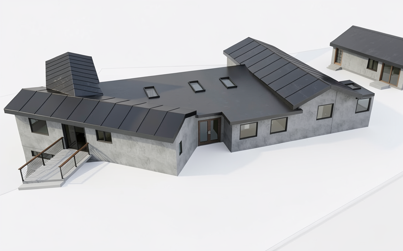 white grey stucco wall black metal seam room