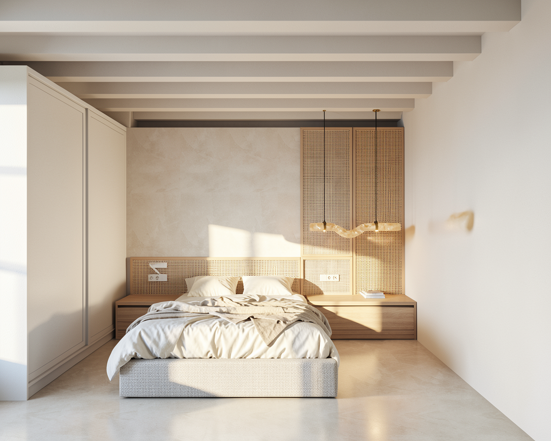 ultra photorealistic render of a contemporary luxury studio apartment interior staged for real estate marketing compact open plan layout combining kitchen dining living and sleeping zones in a modern urban apartment kitchen features matte black lower cabinets clean white upper cabinets elegant white marble backsplash with subtle beige veining integrated cooktop minimalist sink with brushed brass faucet and seamless built in storage floor finished in light natural oak wood with soft matte texture walls painted warm neutral white living area includes modern modular sofa in soft off white fabric minimalist round glass coffee table sculptural dining table with geometric base and upholstered contemporary dining chairs custom built in bed wall with integrated shelving and decorative styling elegant brass framed vertical plant divider with lush green cascading plants creates architectural separation between bedroom and living area large floor to ceiling window with sheer curtains allowing soft natural daylight to fill the space lighting is realistic natural daylight mixed with warm recessed ceiling lights and soft ambient indirect lighting natural shadows light bounce and realistic reflections mood is warm upscale calm inviting and designed to attract modern buyers and investors camera angle from living area toward kitchen and bedroom professional real estate photography wide angle 24mm lens eye level balanced composition materials highly realistic matte finishes subtle imperfections accurate reflections high texture detail global illumination ray tracing cinematic lighting ultra realistic materials professional architectural visualization 8k resolution