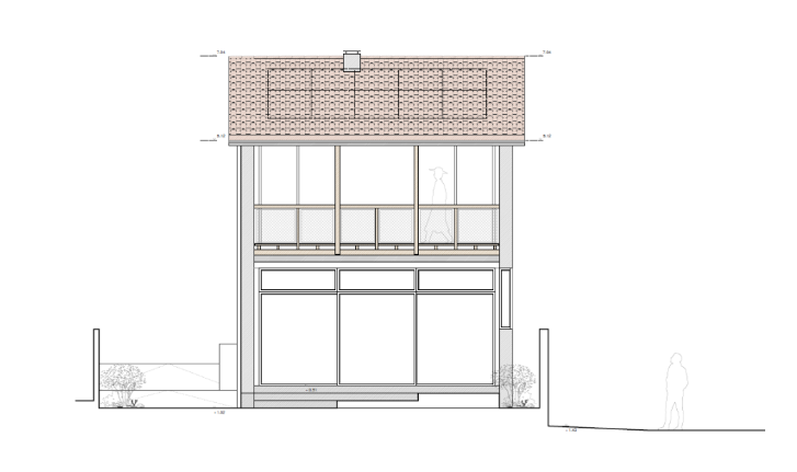vivienda con tejado de teja balc n de madera y grandes cristaleras en la planta baja se ve a trav s del cristal el sal n comedor y en la planta alta se ve a la izquierda un poco del dormitorio y a la derecha un poco del escritorio del despacho el entorno tiene una peque a parcela con un muro a mano izquierda y un poco de jard n a mano derecha al fondo se ve la sierra