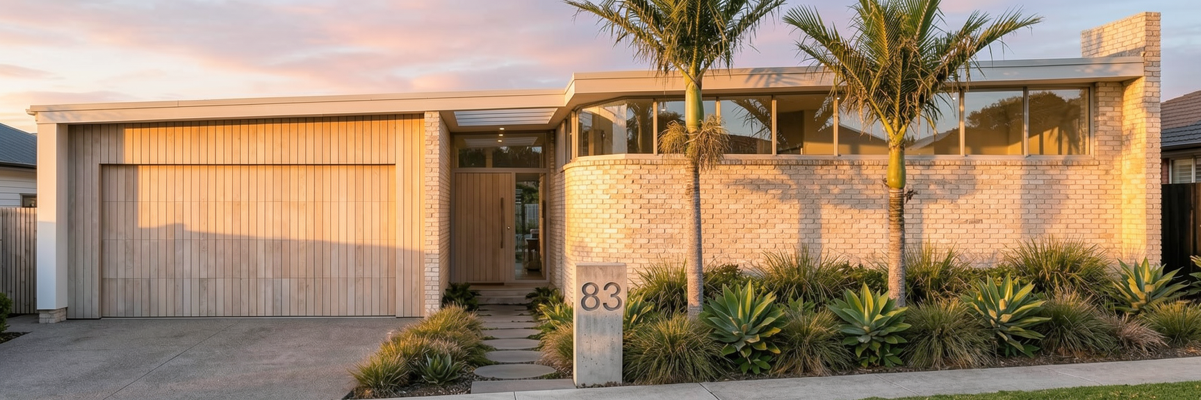 photorealistic front elevation rendering follow the floor plan reference image for protruding garage front entry and porch details white board and batten light ivory colored stonework