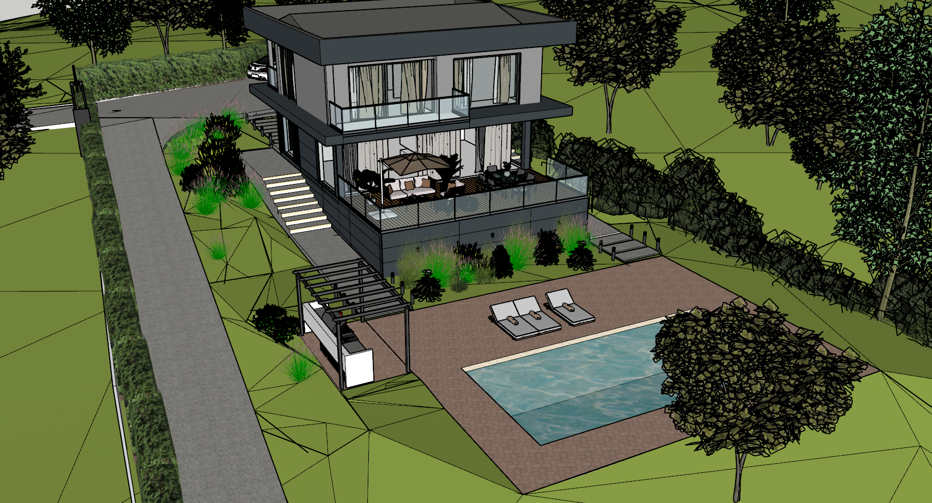 render a modern minimalist two story house with large glass windows and a flat roof use a sleek gray and white color scheme for the building surround it with lush green trees and bushes adding vibrant pops of pink and purple flowers feature a sparkling blue swimming pool in the foreground with a light tan deck area and two white sun loungers the driveway should have a smooth gray texture framed by neatly trimmed hedges set the scene in a warm sunny atmosphere with clear blue skies casting soft shadows