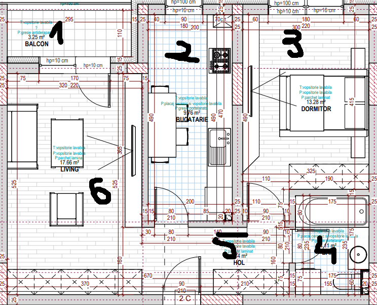 1 balcon 2 bucatarie 3 dormitor 4 baie 5 hol 6 living