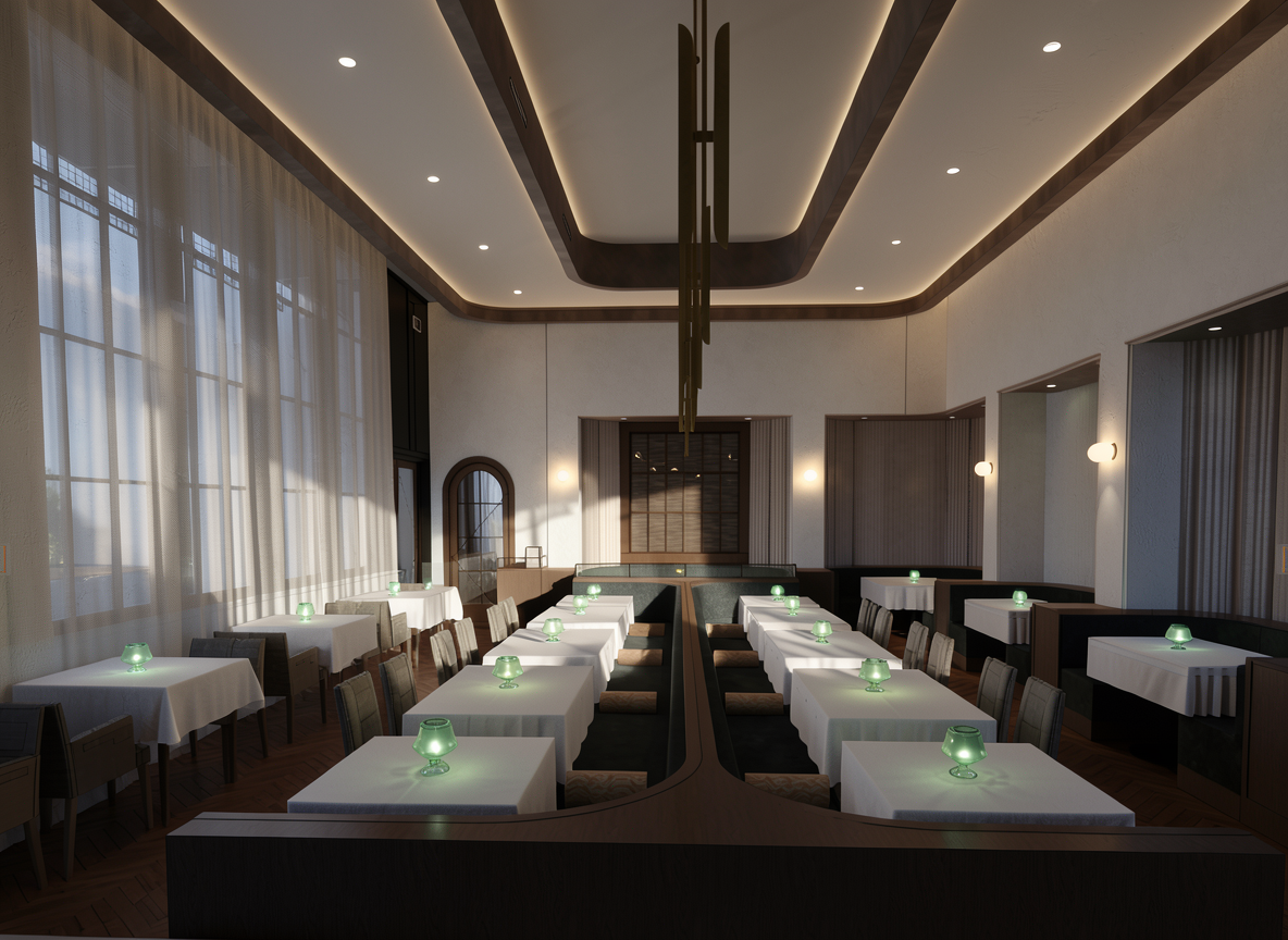 make the sunlight dim turn lights on that are shown in the image the globes on the right side are wall sconces add cove light around outer ring of ceiling no reflection on the table tops make it look like the table tops have soft white linen table cloths on them make sure the white walls shown show a soft plaster texture bring down the sunlight a bit more and make it look a little moodier make the wall sconces frosted white glass make the table votives glow a little and turn them a soft deep olive yellow green venetian glass take only the outer cove light glow off the rendering