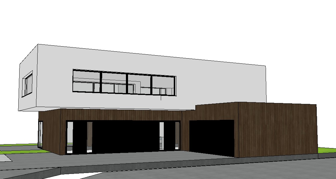 create a realistic image the facade on the ground floor should be made of dark clinker bricks the entire upper floor in white add 2 3 small birds in the sky add a black mercedes g class in front of the garage on the right