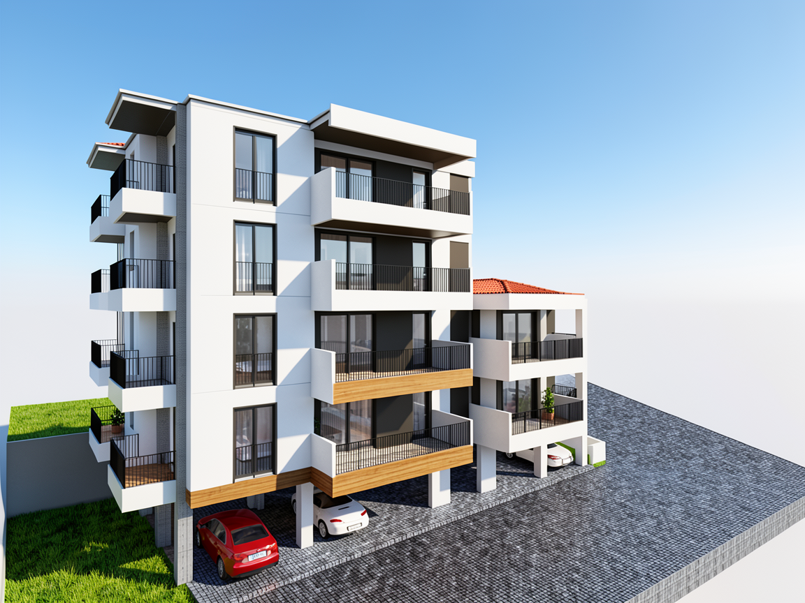 enhance image quality to be as realistic as possible add a terrace in front of the patio doors furnished with outdoor furniture a grill and potted plants remove the large tree on the left edge of the image preserve the lawn but integrate a landscaping design with additional plants and flowers it is crucial that the furniture proportions are realistic and match the architectural scale of the building