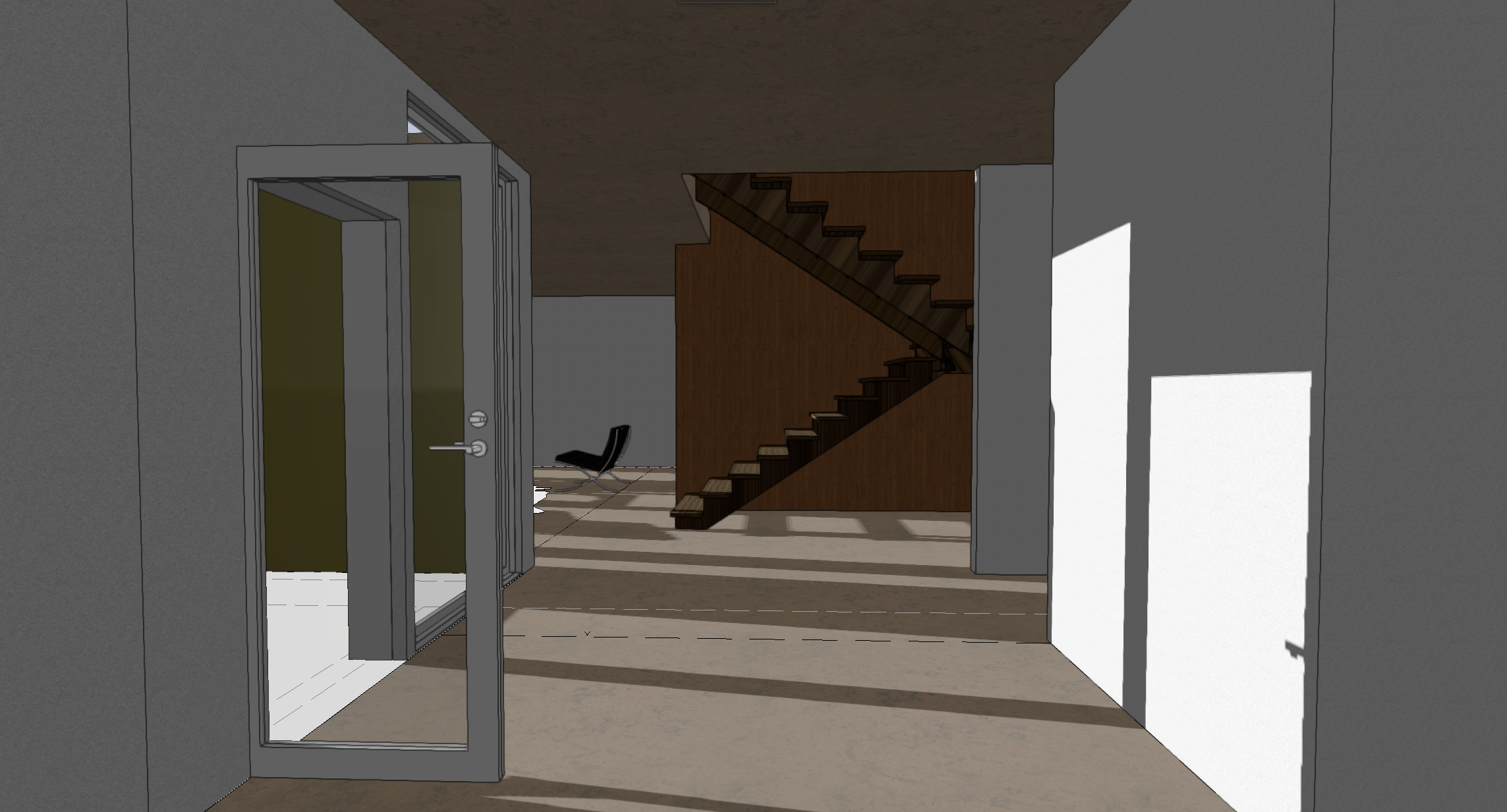 keep geometry including stair landing mid century modern look add some big house plants in pots underneath the staircase and put a jackson pollock painting centered on the right wall floor is travertine stone the white walls and ceiling are white drywall direction of soft orange sunlight is going from left to right coming through the back room and door to shine on the stairs