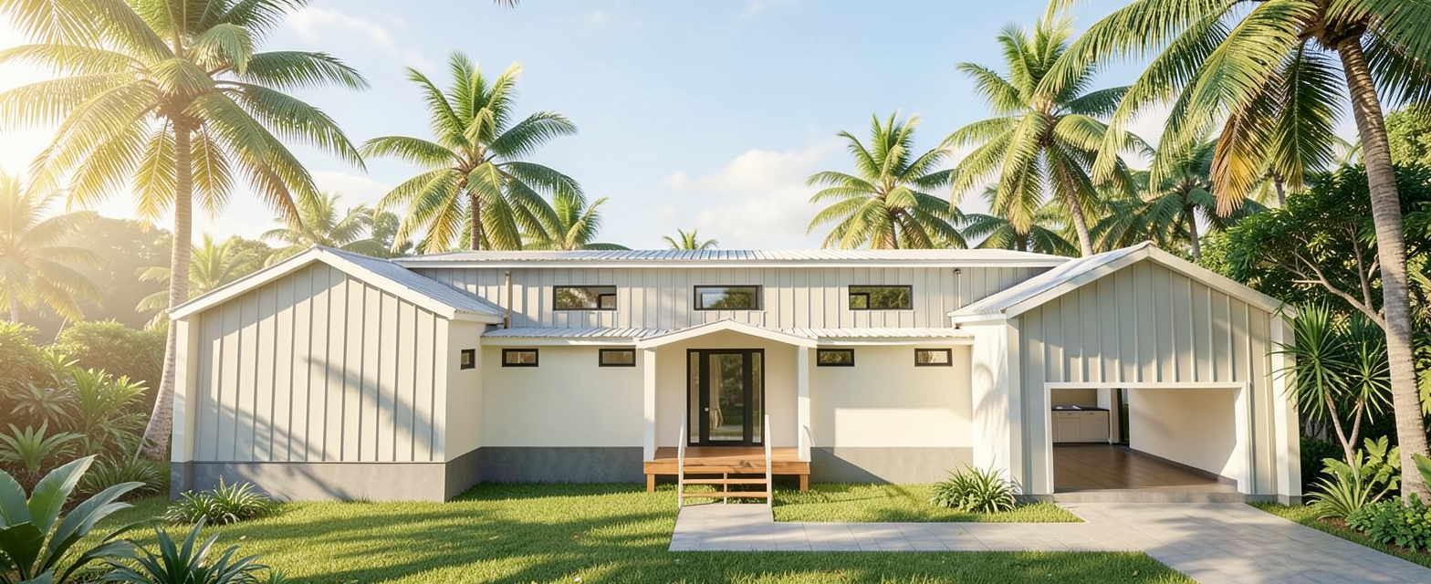 a manicured lawn layered flower beds low maintenance shrubs native plants stone pathway leading to the entrance add a rectangular pool on the left side of the house add a glass walled rectangle gazebo with teak furniture and white cushions add fancy landscaping put a black aluminum dance around the pool and gazebo add an outdoor kitchen near the patio stairs add a teak dining set near the outdoor kitchen add a light gray slide to the far left side of the pool make the siding sherwin williams iron ore color do not add any brick or stone make the roof charcoal make the windows black no steps no paver paths